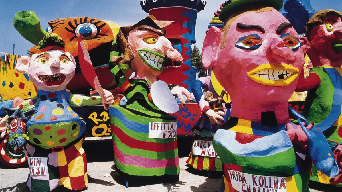 Ein Karnevalsumzug mit Pappmaché-Figuren auf Malta.