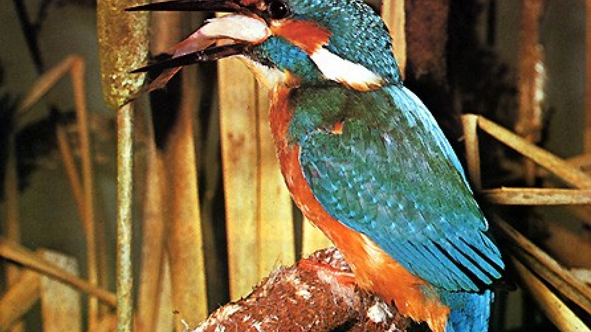 Sein Bestand ist bedroht durch die Verbauung natürlicher Ufer an stehenden und Fließgewässern und damit einem Mangel an Brutplätzen: der Eisvogel. Er ernährt sich von Insekten, Kaulquappen, Fröschen und kleinen Süßwasserfischen. Wo er lebt, sind die Gewässer gesund. Das ist allerdings immer seltener der Fall, so dass sich angeblich nur noch 4.500 bis 7.000 Brutpaare in Deutschland aufhalten.Auffallend ist das Gefieder des Eisvogels: Auf der Oberseite ist es blau schillernd und daher eine perfekte Tarnung, weil es nicht von der Farbe des Wassers zu unterscheiden ist. Die Unterseite ist bräunlich oder sogar orange. Unverwechselbar sind die weißen Flecken an der Halsseite. Übrigens war der Eisvogel auch 1973 Vogel des Jahres.