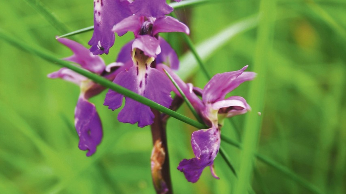 Sein Lebensraum ist bedroht durch die Zunahme von Büschen auf zuvor offenen Wiesen und durch die hohen Bestände an Wildschweinen, die seine Knollen ausgraben und fressen: das Männliche Knabenkraut. Alle in Deutschland vorkommenden Orchideenarten – das sind rund 40 – stehen auf der Roten Liste der Gefährdeten Arten. Das Männliche Knabenkraut wird bis zu 70 Zentimeter hoch und hat einen mit bis zu 30 purpurrot blühenden Einzelblüten besetzten Blütenstand. Es kommt vor allem in Mittel- und Süddeutschland, vereinzelt auch an der Ostseeküste vor.