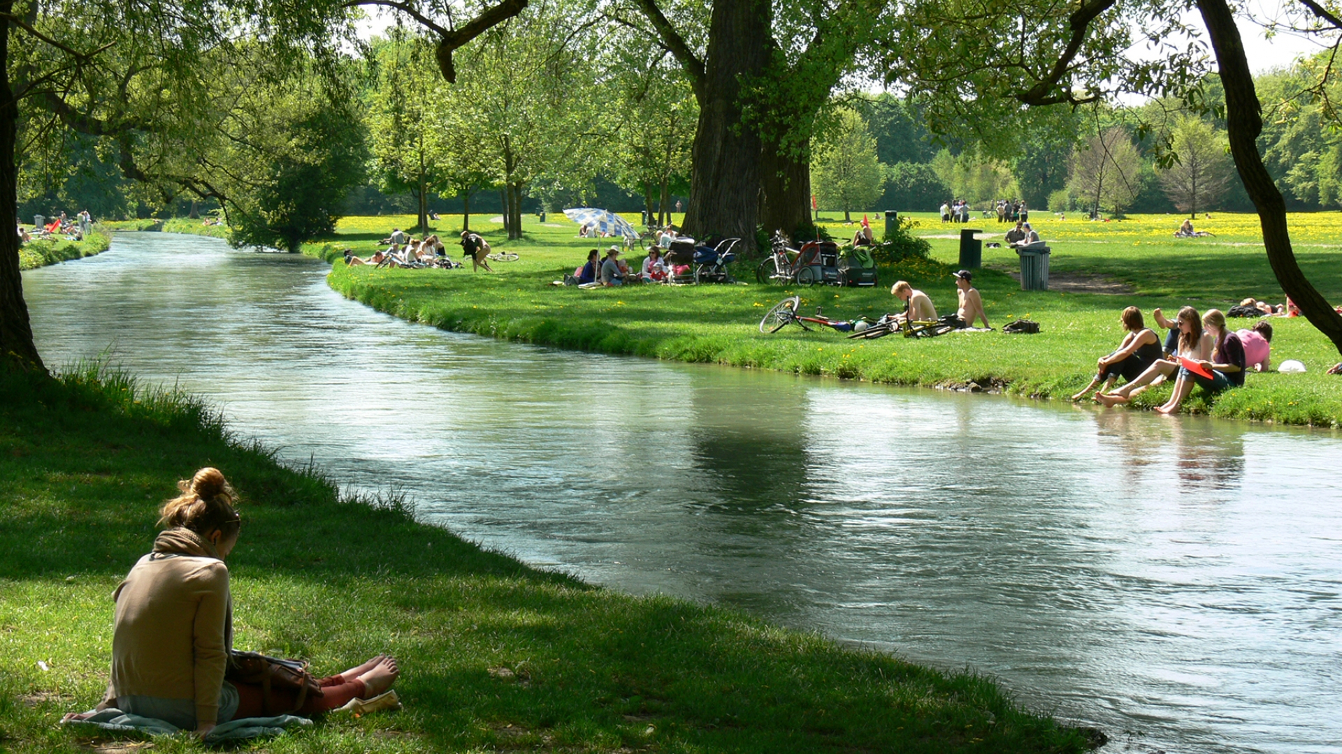 Dagmar Oberndorfer: Die Strömung des Eisbaches treibt Badende, Blätter und Zweige wie eine gigantische Wasserrutsche an flanierenden Parkbesuchern vorbei, unter Brückchen hindurch und zu einem romantischen, kleinen Wasserfall. Im kühlen Nass zu planschen ist ein grandioser Spaß. Die Liegewiese nebenan ist im Vergleich eher langweilig, aber sie taugt hervorragend, um Bikini und Badehose zu trocknen, bevor es auf eine Bratwurstsemmel zu den Grillständen geht.