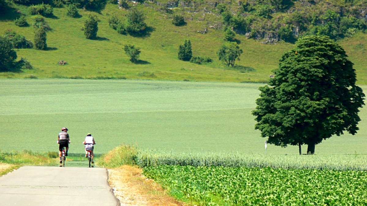 In Rennertshausen an der Donau - unweit von Neuburg - erreicht der Amper-Altmühl-Radweg das Tal der vorgeschichtlichen Donau und bringt die Radler nach Dollnstein im Altmühltal.Bis vor 130.000 Jahren grub sich hier die Donau in den Grund. Dann fand sie ihren heutigen Lauf und hinterließ ein Tal, dass für Radler 24 km puren Genuss bedeutet. Ungestört vom Autoverkehr führt der Radweg durch einen Landstrich, der dem Landschaftsideal eines Modelleisenbahners verstörend nahe kommt.Aus den bewaldeten Hängen des Tals brechen schroffe Kalksteinfelsen, teilweise durchsetzt von Höhlen und oft umgeben von malerischen Trockenheiden. Der Talgrund bietet ein Wechselspiel von Wäldern, Agrarlandschaften und Feuchtgebieten, dazwischen Dorfkirchen und mittelalterlichen Burgen. Die zahlreichen verschiedene Grün-Töne dieses Tal sind atemberaubend. Der Genuss ließe sich wohl nur noch durch Außentemperaturen unter 34 °C steigern.