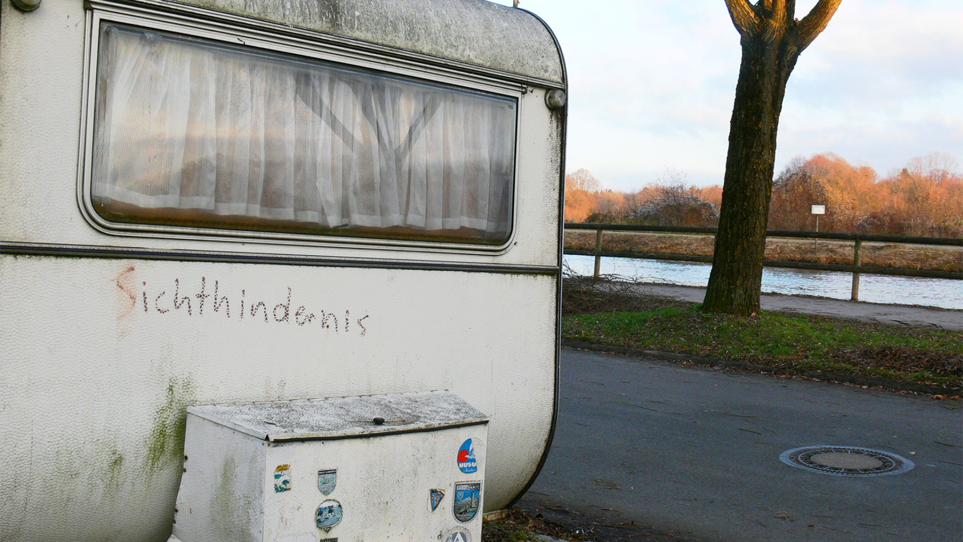 Hier fühlte sich wohl jemand durch den am Straßenrand abgestellten Wohnwagen perspektivisch eingeschränkt.