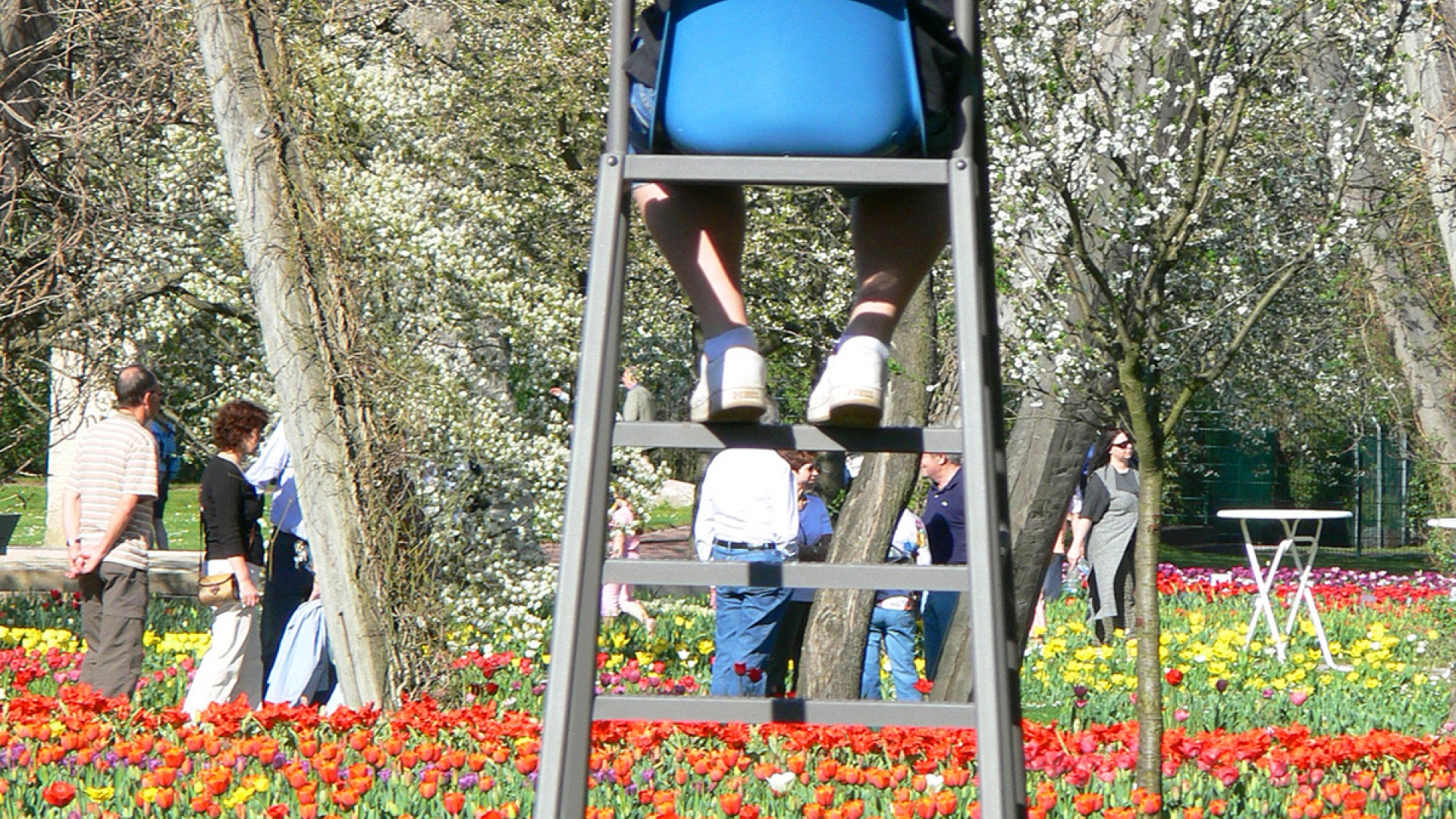 Von einem Hochsitz, wie ihn sonst Tennis-Schiedsrichter benutzen, lassen sich die Tulpenbeete bestens vor Pflückattacken schützen.