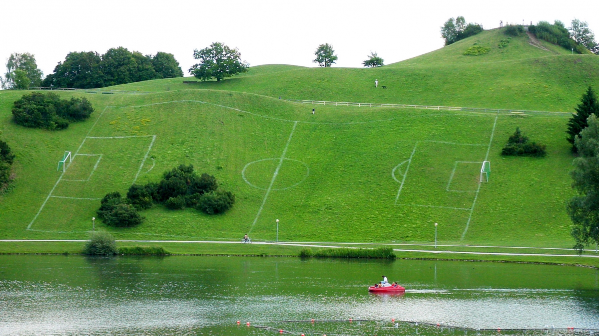 Dieses schräge Fußballfeld schmückte 2006 als Kunstinstallation den Olympiapark in München.