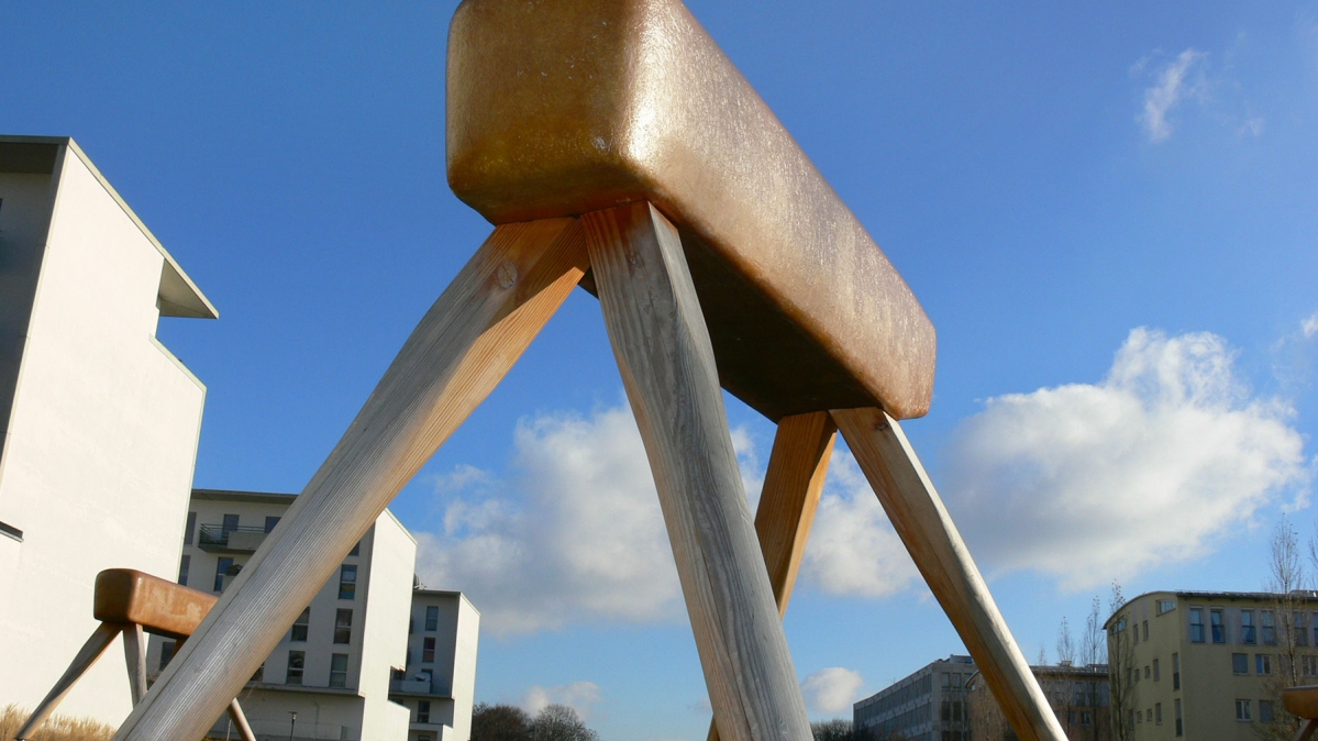 Aus der Froschperspektive werden die Turnhalle-Böcke auf einem Münchener Spielplatz zu eindrucksvollen Skulpturen.
