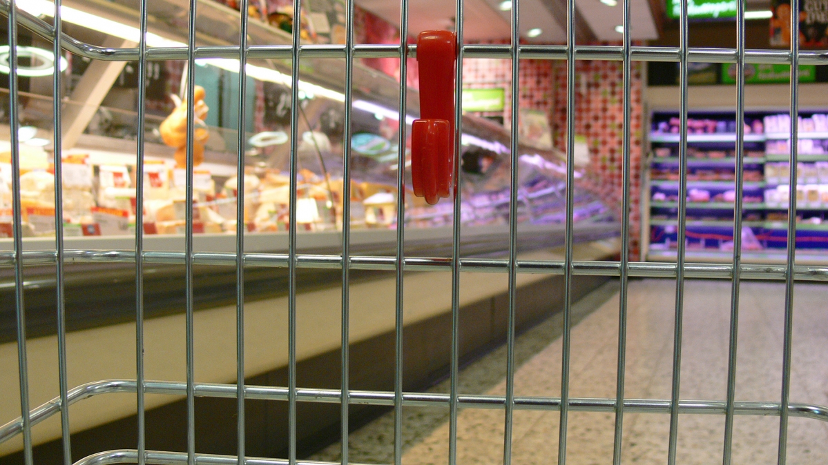 Vom Einkaufswagen aus steckt der ganze Supermarkt hinter Gittern.