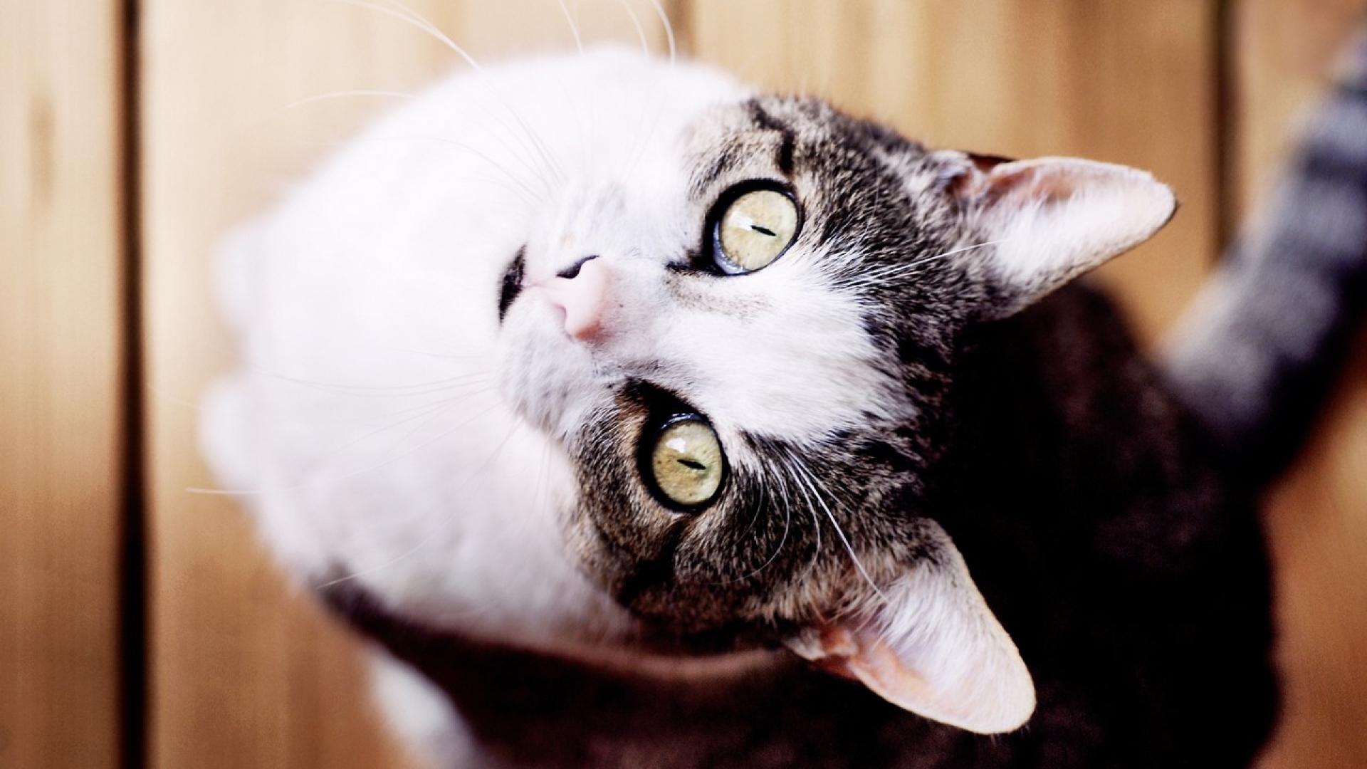 Tierporträt: Eine Katze blickt in die Kamera. Hauskatzen sind Züchtungen von Wildkatzen, genau genommen von einer Unterart, der Nubischen Falbkatze. Die wurde bereits von den alten Ägyptern domestiziert. Das war vermutlich vor 3000 Jahren, eventuell auch früher. Die Hauskatze kam um Christi Geburt nach Europa und verdrängte als Mäusefänger das Frettchen. Grundsätzlich lassen sich Langhaarkatzen und Kurzhaarkatzen unterscheiden, außerdem existieren viele Rassen in unterschiedlichen Farbschlägen.