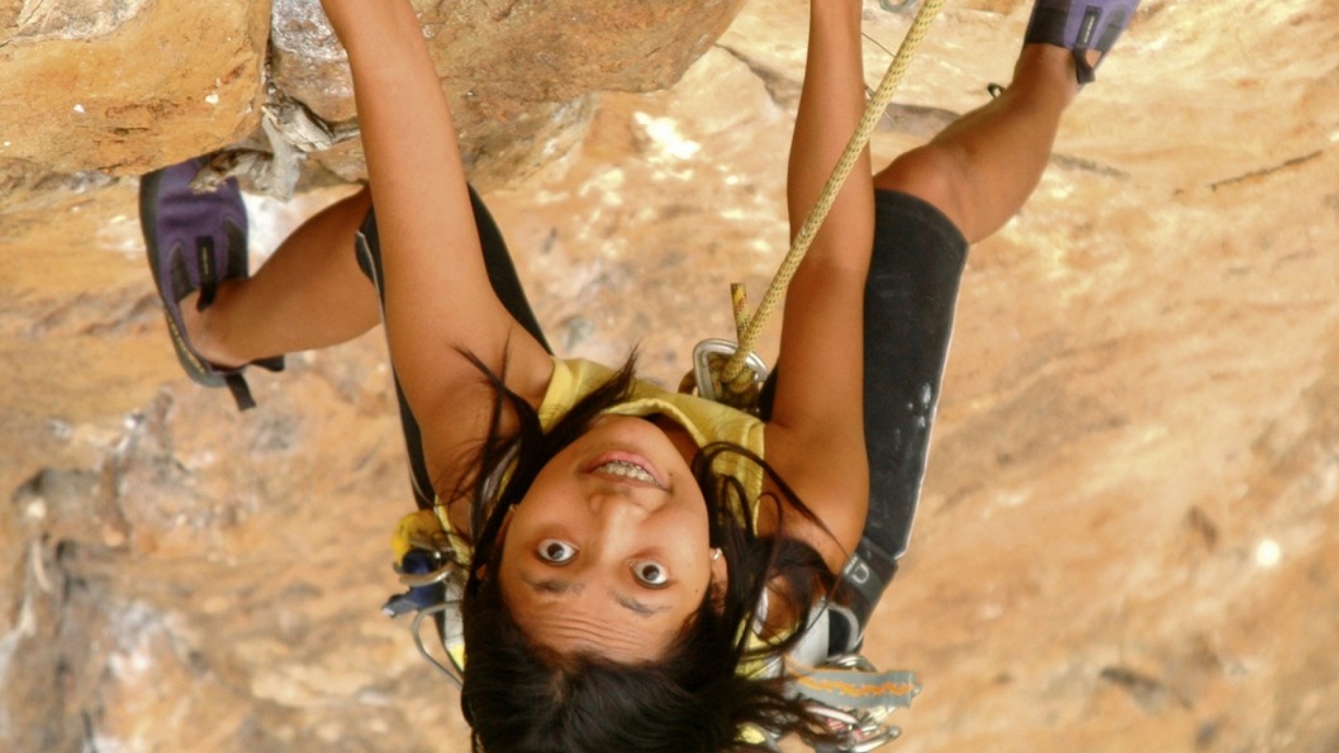 Eine Asiatin klettert - oder hängt? - an einer Felswand. Natürlich ist sie mit einem Seil gesichert. Klettern kann man am natürlichen Fels oder an künstlichen Hallenwänden. Meist gibt es bestimmte Routen, die durchklettert werden. Varianten sind u. a. das Freeclimbing und das Eisklettern.
