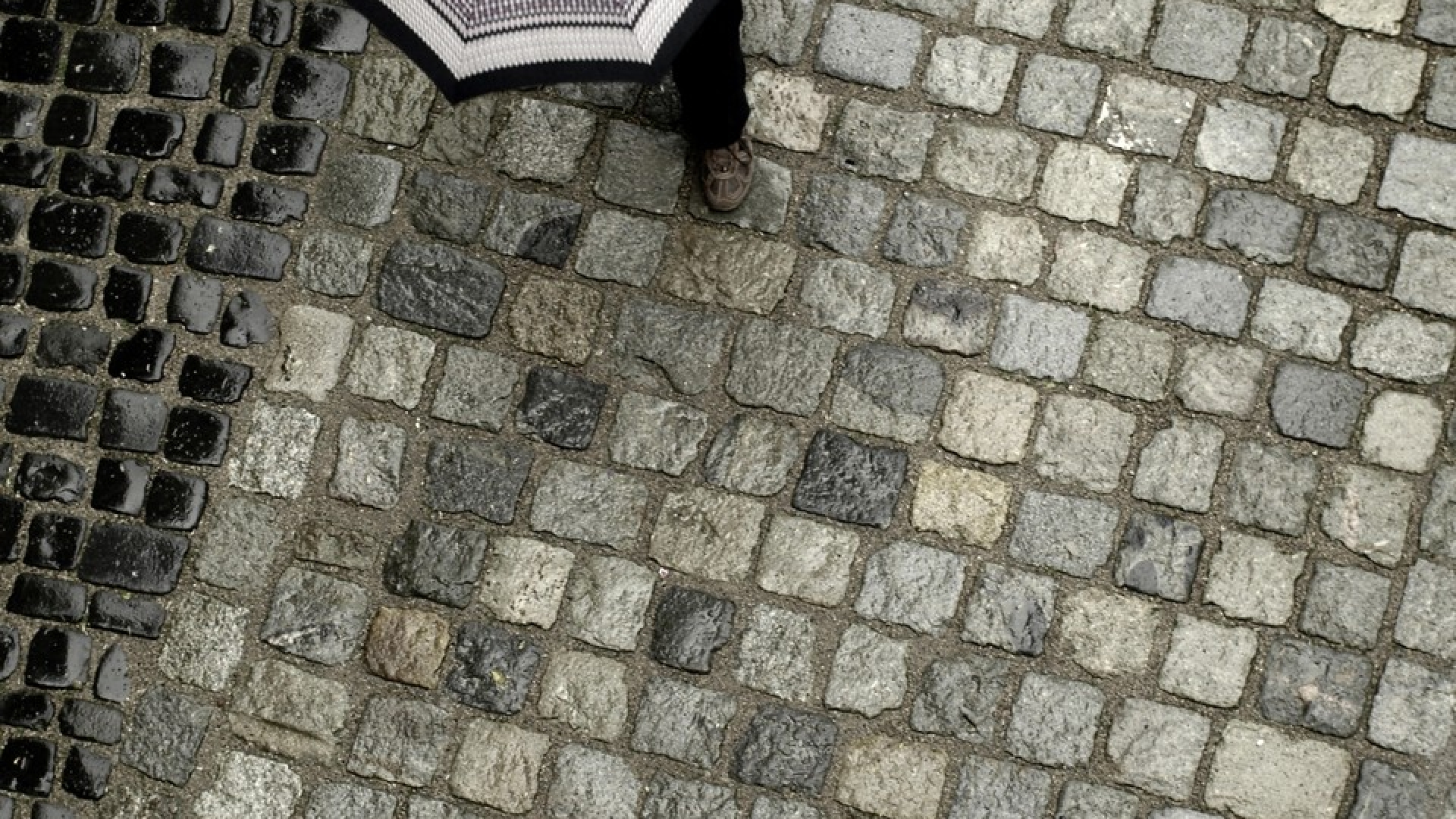 Grau wie das Wetter sind Schirm und Pflastersteine. Regentropfen haben einen Durchmesser zwischen 0,5 mm und 7 mm. Wenn kleinere Tropfen vom Himmel fallen, spricht man von Nieseln, größere zerplatzen nach kurzer Fallstrecke. Die größte Fallgeschwindigkeit liegt bei 8 m/s. Schirme wurden ursprünglich nur gegen Sonnenbestrahlung verwendet. In asiatischen Ländern, in altägyptischen und babylonischen Kulturen gelten Schirme als Ehrenzeichen (z. B. Herrscherattribut). Seit der 2. Hälfte des 17. Jahrhunderts gibt es den Schirm als Wachstuchschirm gegen Regen; im 18. Jahrhundert kamm der Stockschirm aus, und seit 1926 ist er als zusammenschiebbarer Taschenschirm gebräuchlich.