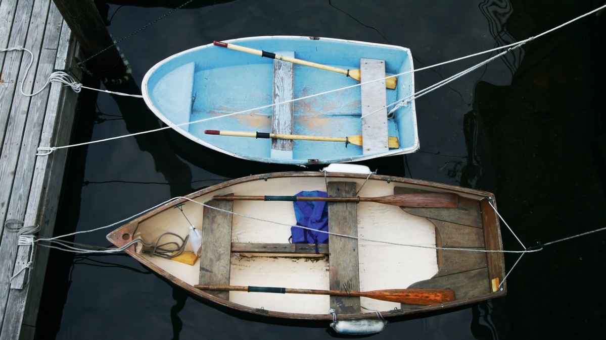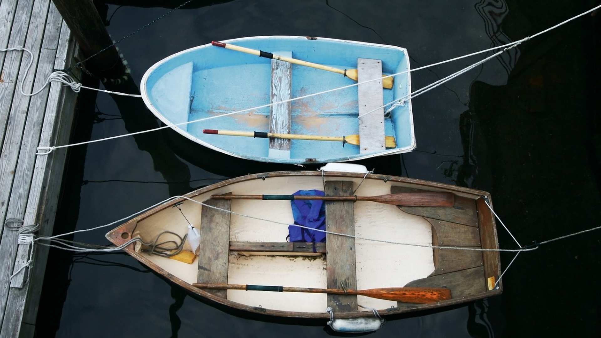 Zwei kleine Fischerboote am Hafen. Diese kleinen Wasserfahrzeuge waren bereits als Einbaum-, Fell- oder Korbboote bei ältesten Kulturen bekannt. Einbaumboote bestehen aus einem ausgehöhlten Baumstamm. Fellboote sind von außen mit Fell überspannt (z.B. Kajak, Bullboot) und Korbboote sind rund oder oval aus Weiden geflochten.