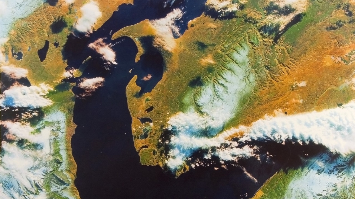 Eine Satellitenaufnahme der Magellanstraße. Das Bild zeigt die Meerenge mit zahllosen Inseln und Seitenkanälen zwischen dem südamerikanischen Festland (Chile, Argentinien) und der Insel Feuerland (Tierra de los Fuegos). Die Magellanstraße ist 583 km lang, die engste Stelle ist 3 km breit. Sie verbindet den Atlantischen mit dem Pazifischen Ozean. An der Magellanstraße gibt es bedeutende Erdöl- und Erdgasvorkommen.