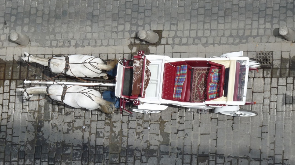 Zwei Schimmel ziehen die Kutsche. In vielen Städten werden Kutschfahrten speziell für Touristen angeboten. Schimmel sind Pferde, die dunkelhaarig geboren, aber mit zunehmendem Alter allmählich weiß werden. Die Schimmelung beruht auf einer dominanten Erbanlage und dauert etwa zehn Jahre. Wird ein Pferd schon weiß geboren, ist es ein Albino.