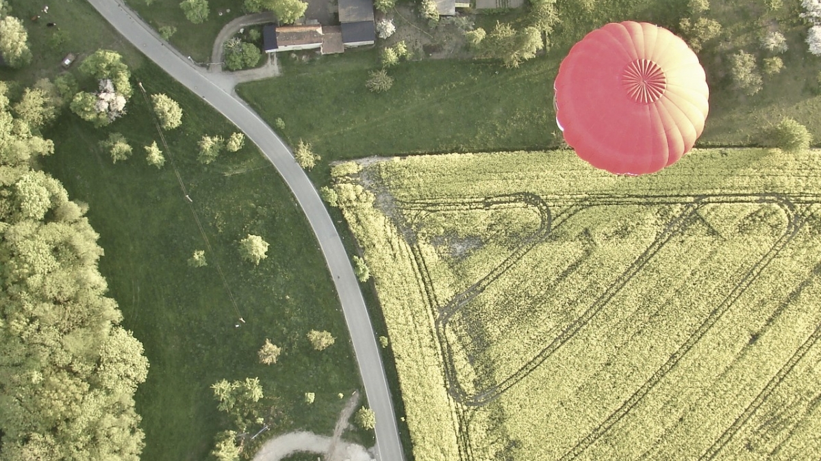 Abenteuer in der Luft: eine Ballonfahrt mit Sicht auf Wiesen, Felder, Einfamilienhäuser. Ein Heißluftballon ist leichter als Luft. Er besteht aus einer gasdichten Hülle aus Seidengewebe (Ballonstoff) oder Kunststofffolie, die mit einem Traggas (Wasserstoff, Helium, Leuchtgas, Heißluft) gefüllt ist und durch den Dichteunterschied zwischen Traggas und Luft einen statischen Auftrieb liefert.