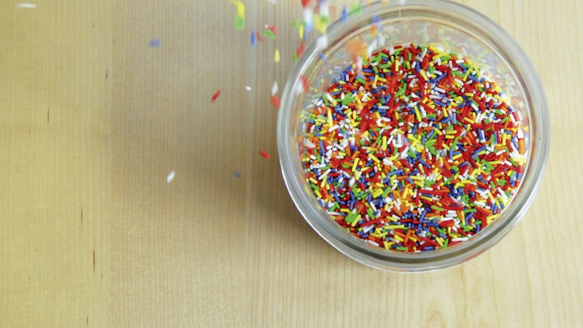Ob zum Backen, Naschen oder Dekorieren - süße Streusel müssen bunt sein. Oben im Bild sind fallende, durch die Bewegung unscharfe Streusel zu sehen.
