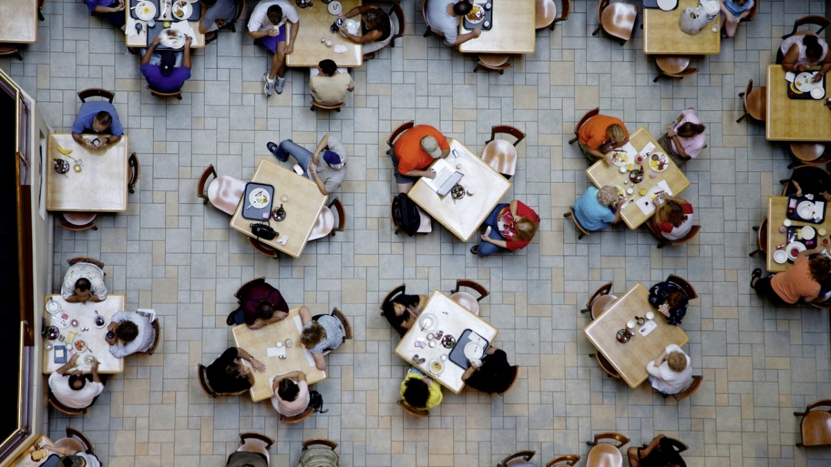 Vierertische in einer Mensa, einem Speiseraum für Massenverpflegung.