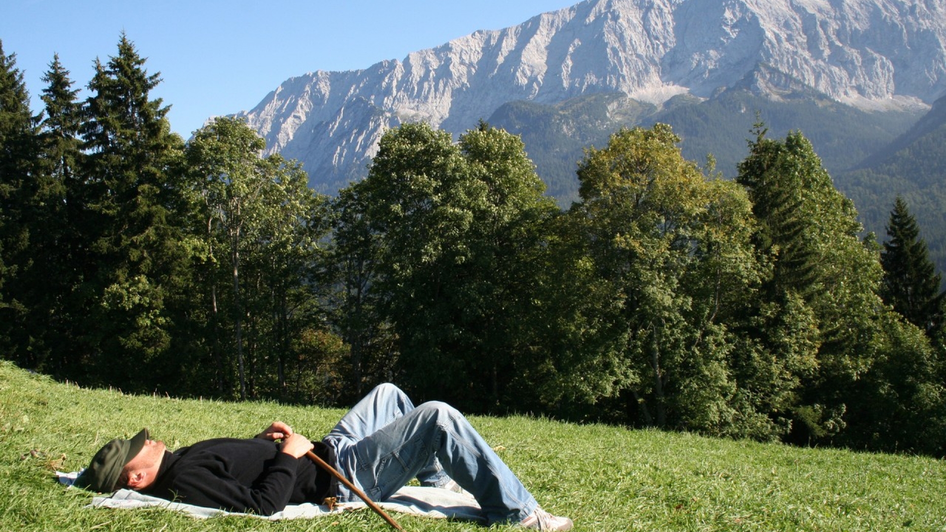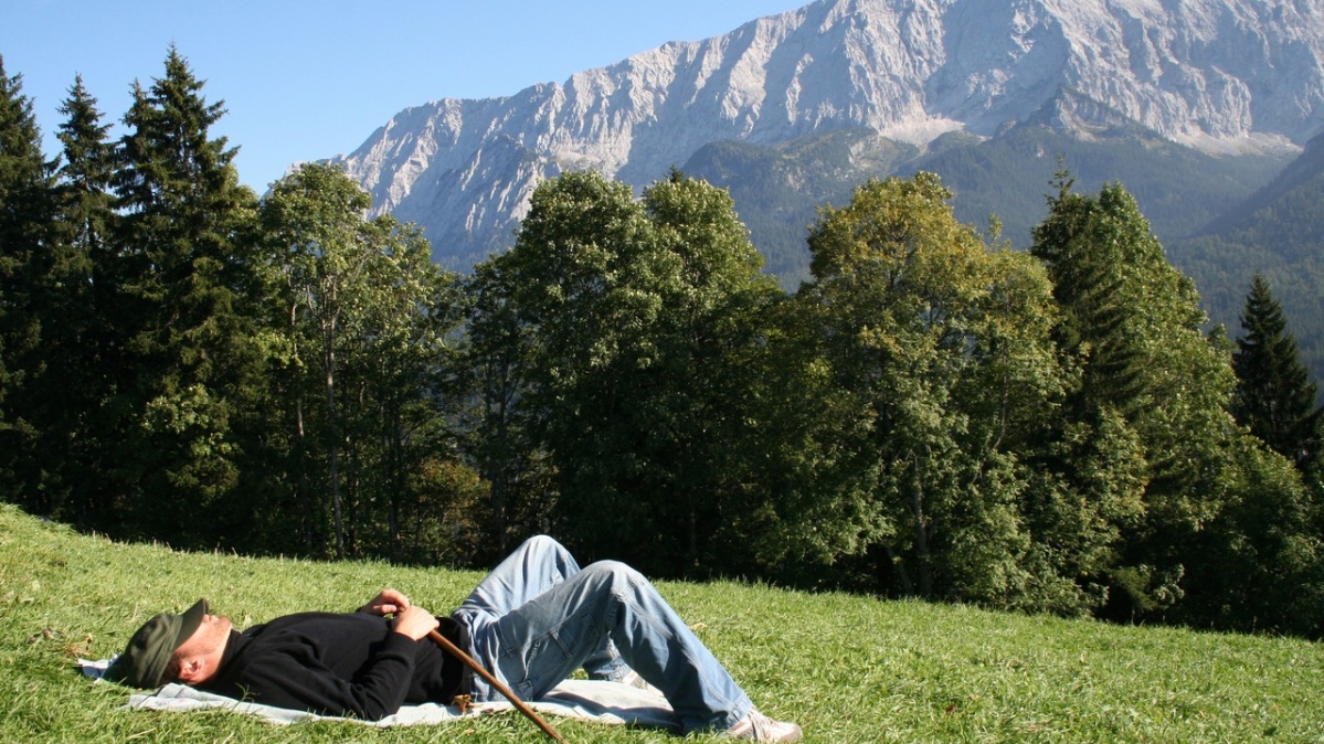 Wohlverdientes Nickerchen nach dem Aufstieg. Ein Herr auf einer Alm in den bayerischen Bergen.