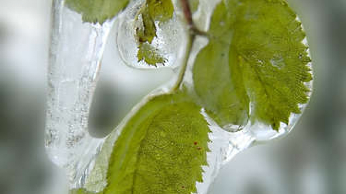 Es könnte eine schleimige Masse sein, die an den Blättern zäh hinunterläuft. Tatsächlich hat sich hier aber eine Eishülle um die Blätter gelegt.