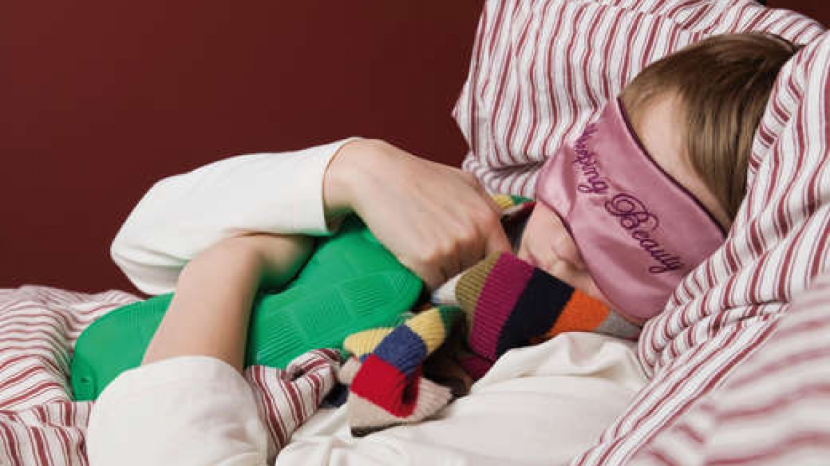 Wer krank ist, braucht es warm. So kann das aussehen: Wärmflasche, angenehme Bettwäsche, Schal und die Schlafbrille für guten Schlaf bei Tageslicht.