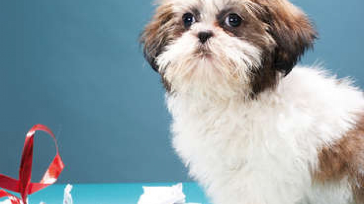 Der Hund schaut so, als wäre er sich gerade nicht mehr sicher, ob es richtig war, das Papier wild zu zerreißen.