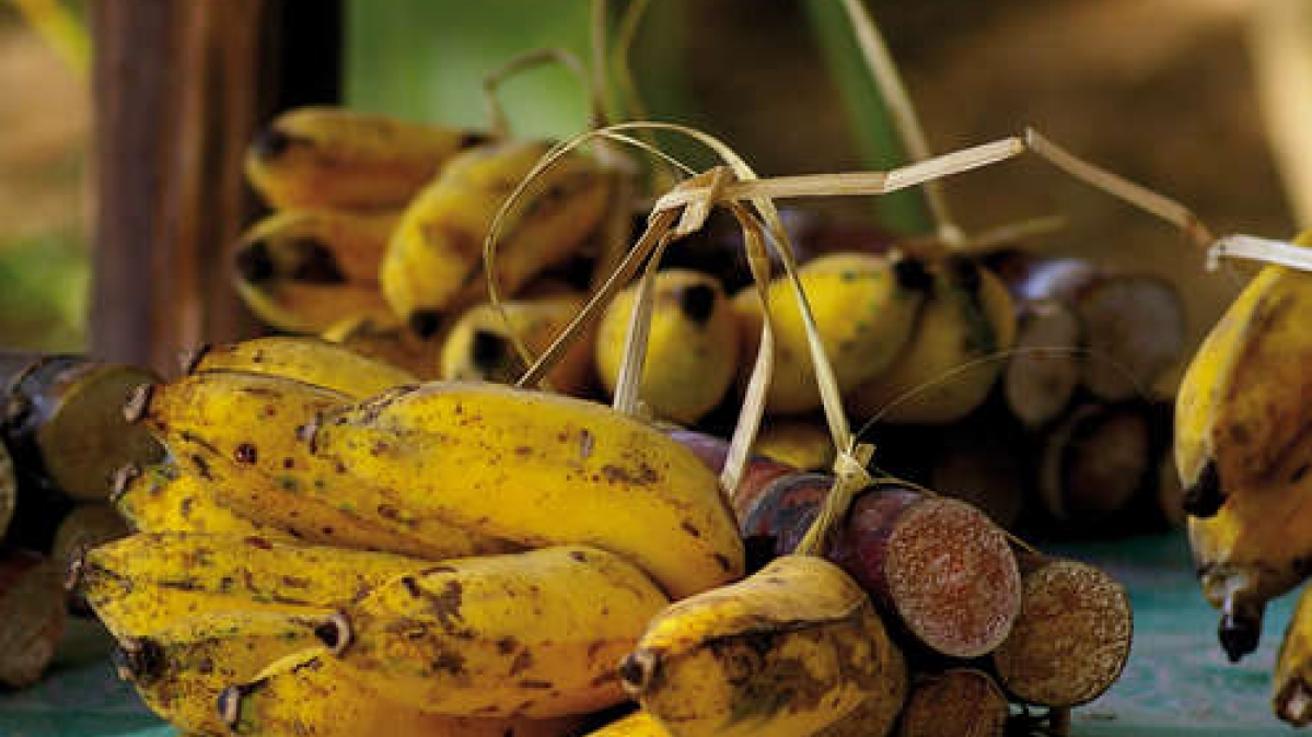 Bananen und Zuckerrohr - das lieben Elefanten. Hier sind die Essensrationen mit Bast zusammengebunden. Bast ist in Deutschland als Verpackungsmaterial beliebt und mittlerweile in vielen Farben zu haben.
