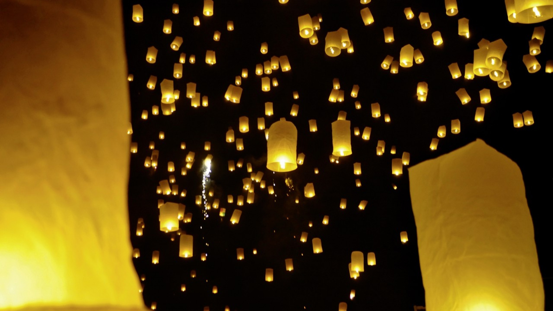 Fliegende Papier-Lampions aus dem thailändischen Chiang Mai. Die Lampions sind kleine Heißluftballons aus Seidenpapier. Mit ihnen sollen die eigenen Wünsche in den Himmel steigen - und sich erfüllen.