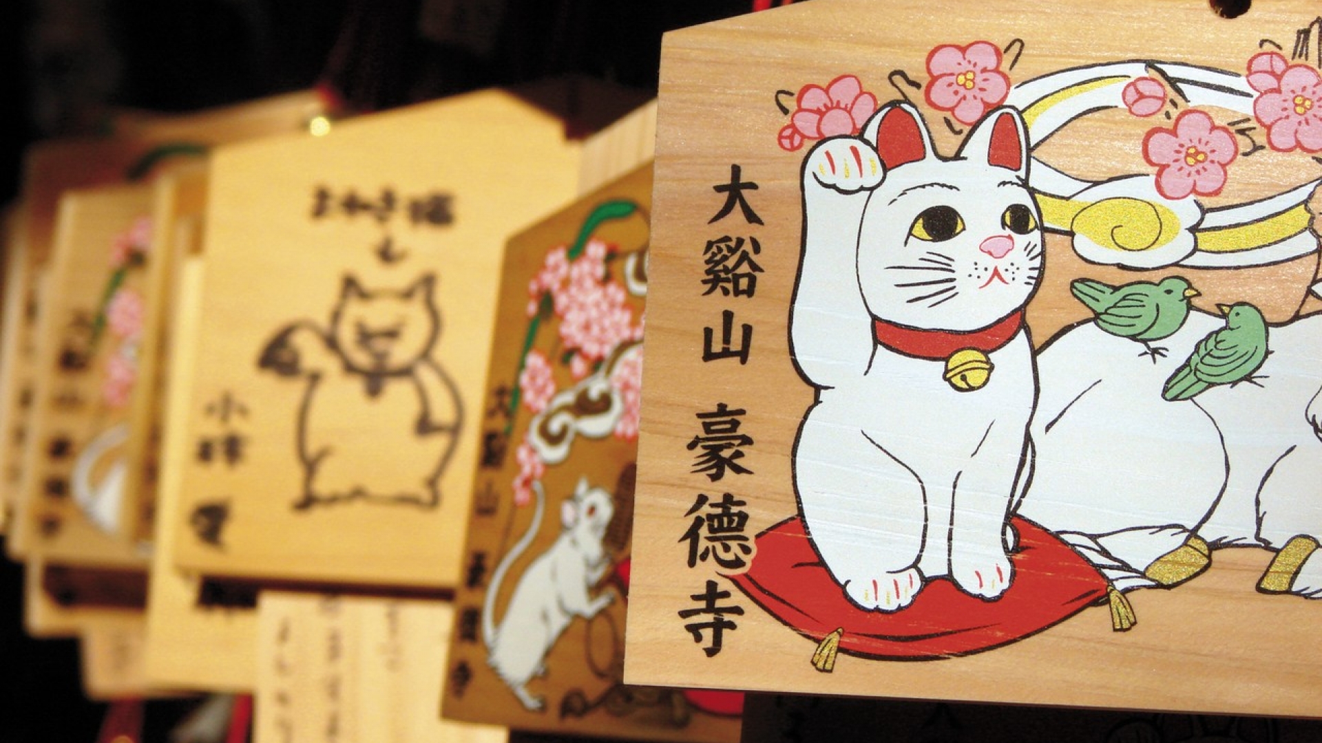 ... ist ein Glücksbringer in einem Tempel in Tokio. Maneki Neko ist eine Winkekatze, meist aus Porzellan odr Keramik. Hebt die Katze ihre rechte Pfote, so soll sie Wohlstand bringen. Hebt sie die linke Pfote, verspricht man sich davon mehr Besucher, zum Beispiel in Restaurants. Je höher die Pfote angehoben ist, desto größer soll auch die Wirkung sein.