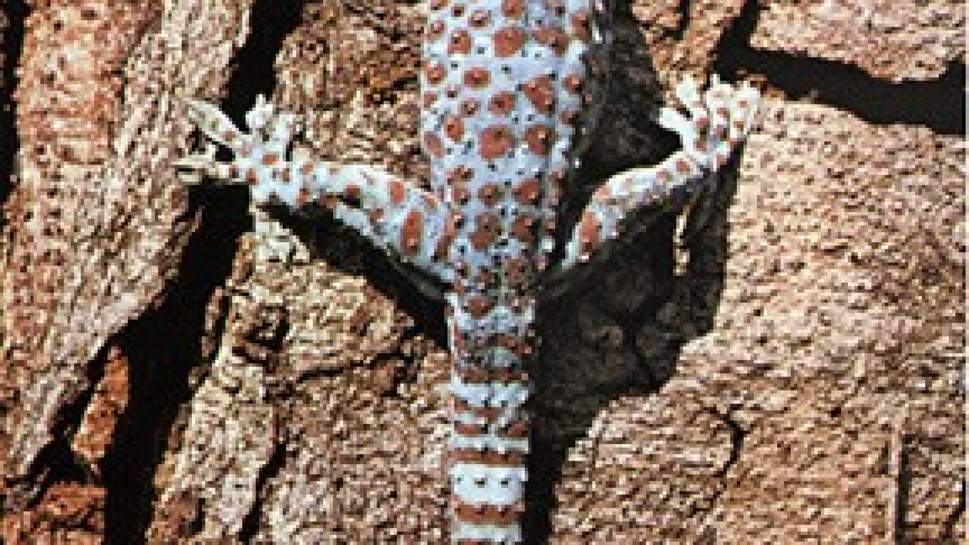 Der Tokee ist ein Einzelgänger, der durch seine Rufe sein Territorium markiert. Diese Rufe haben ihm auch den Namen "Tokee" beschert: Die sind so laut, bellend, quietschig und klingen ein bisschen nach "Tokeeeeee". Das Tier ist bis 35 cm lang und gehört zur Familie der südostasiatischen Geckos. Er kann grau bis violett mit ziegelroten oder blauweißen Punkten sein. Der Tokee jagt Insekten und Mäuse - und gilt als Glücksbringer. Allerdings hieße sich ihm zu nähern, sein Glück herauszufordern, denn der Tokee beißt sehr gern mal zu.