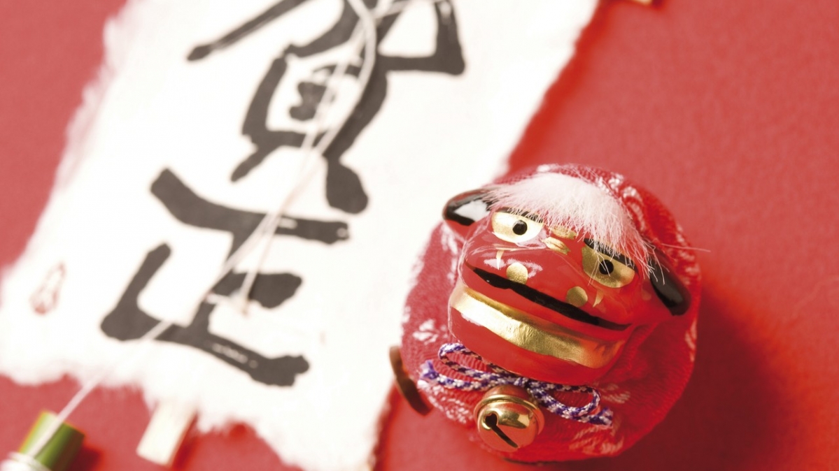 Ein traditioneller japanischer Glücksbringer und der Schriftzug Frohes Neues Jahr: das ist der Daruma, einer der beliebtesten Glücksbringer in Japan - vor allem zum neuen Jahr.