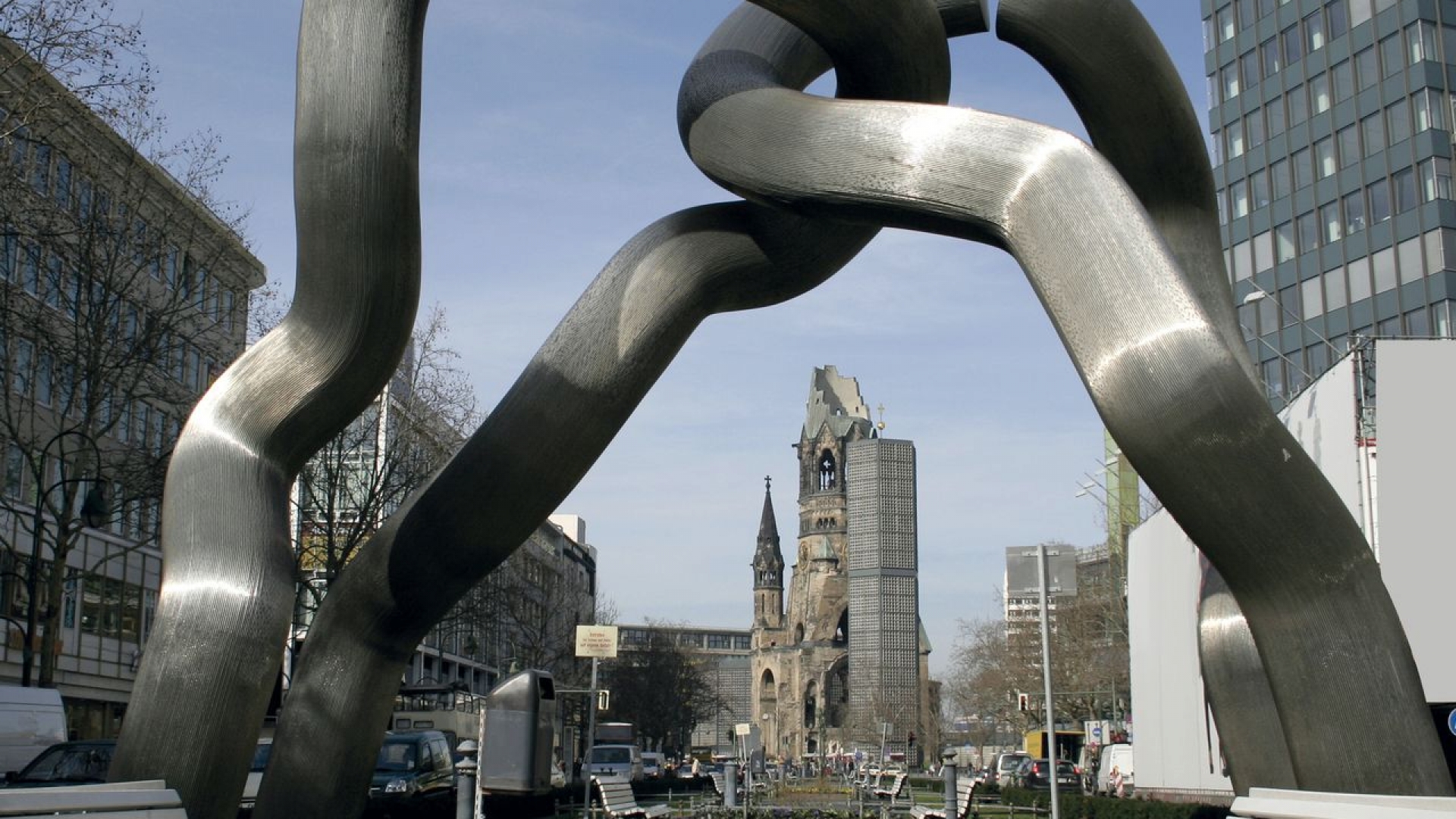 Anlässlich der 750-Jahr-Feier geschaffen steht die Plastik für die Zusammengehörigkeit und die Zerissenheit der deutschen Hauptstadt. Vier verschlungene Arme symbolisieren die Alliierten nach dem 2. Weltkrieg. Die Plastik befindet sich auf dem Mittelstreifen der Tauentzien - im Hintergrund die Gedächtniskirche.Martin Matschinsky und Brigitte Denninghoff