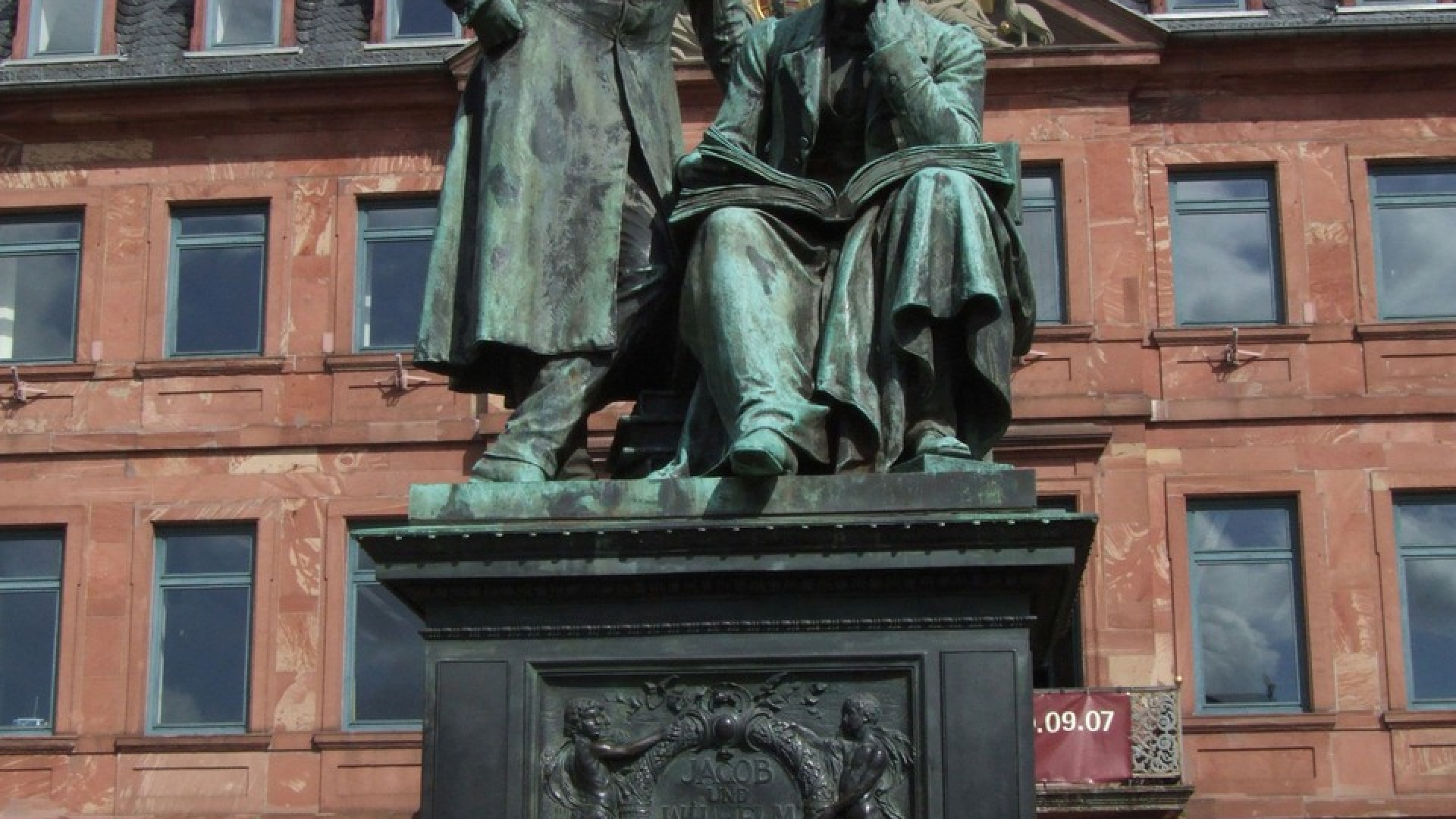 Das Gebrüder Grimm Denkmal steht auf dem Marktplatz ihrer Geburtsstadt Hanau, im Hintergrund befindet sich das Rathaus. Nach der Ausschreibung eines Gestaltungswettbewerbs setzte der Münchner Bildhauer Syrius Eberle einen Entwurf um. Dabei stieß er auf erhebliche Schwierigkeiten bei der Anfertigung des Sockels und der Herstellung des Gussmodells. So dauerte es fünf Jahre vom Vertragsabschluss mit dem Künstler bis zur Enhüllung des Denkmals im Oktober 1896.Syrius Eberle