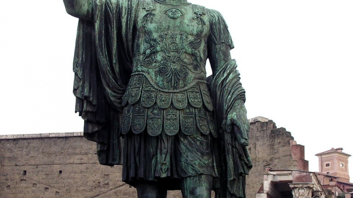 Er trat in die Fußstapfen des am 15. März 44 vor Christus ermordeten Julius Caesar und wurde Kaiser: Augustus. Seine Statue steht vor den Kaiserforen in Rom.