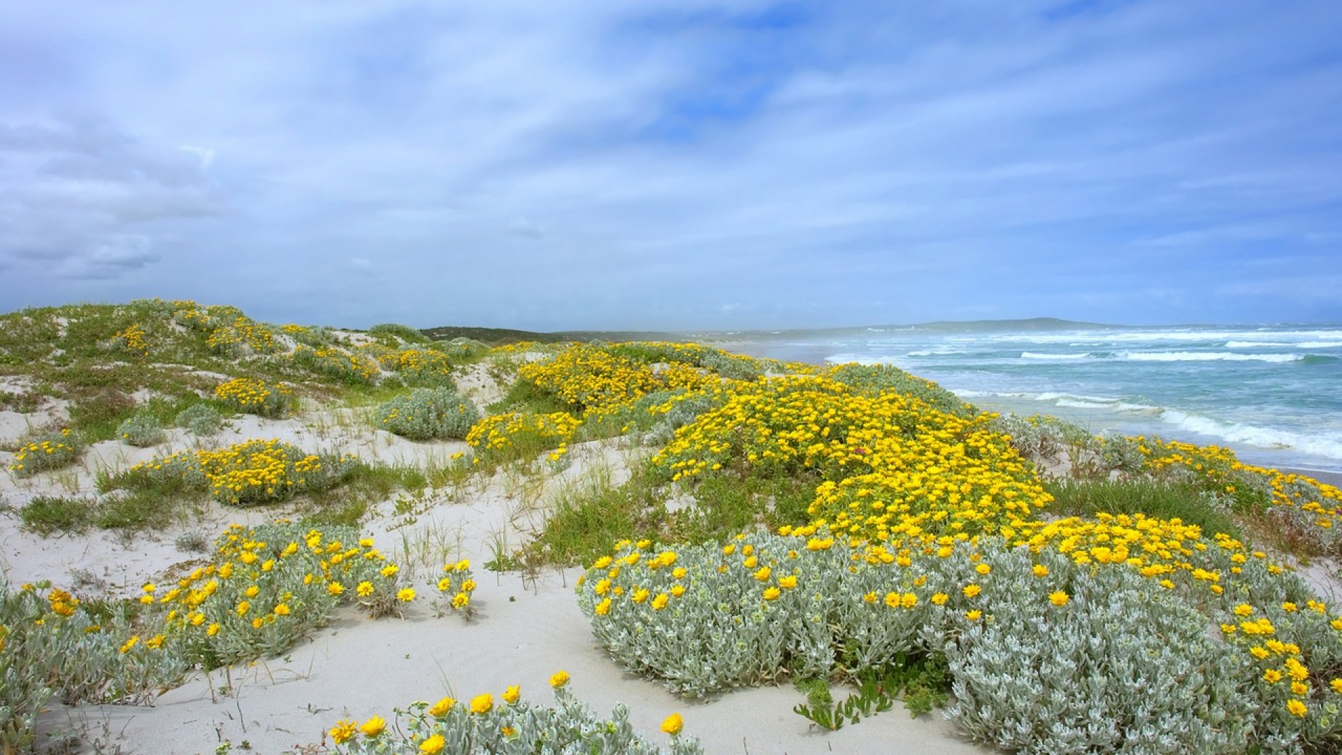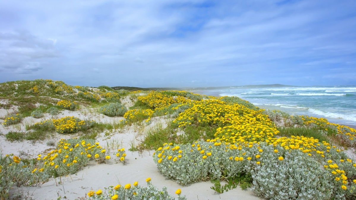 Blühende Landschaft zwischen dem Grotto Bay Naturschutzgebiet und dem Silwerstroomstrand am Westkap.