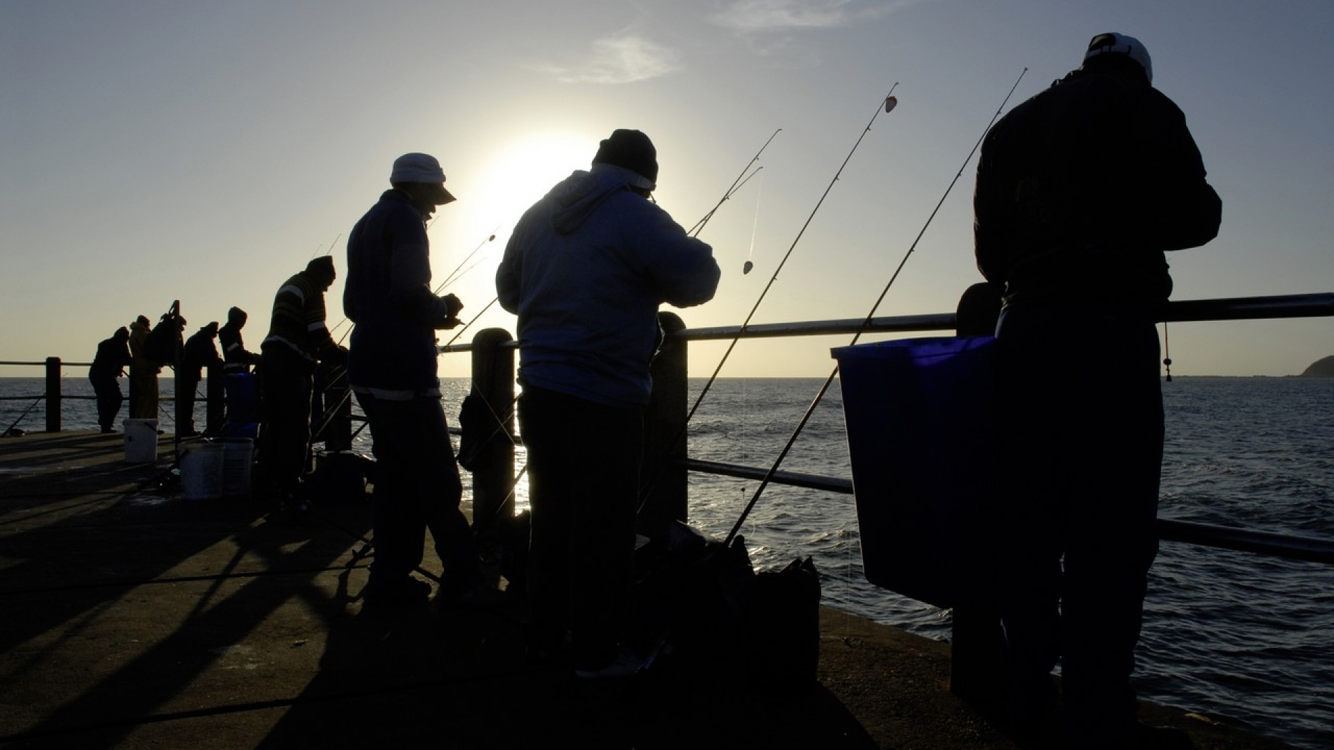 Angler auf einem Pier in Durban (eThekwini), am Indischen Ozean an der Ostküste Südafrikas.Lust auf Südafrika?