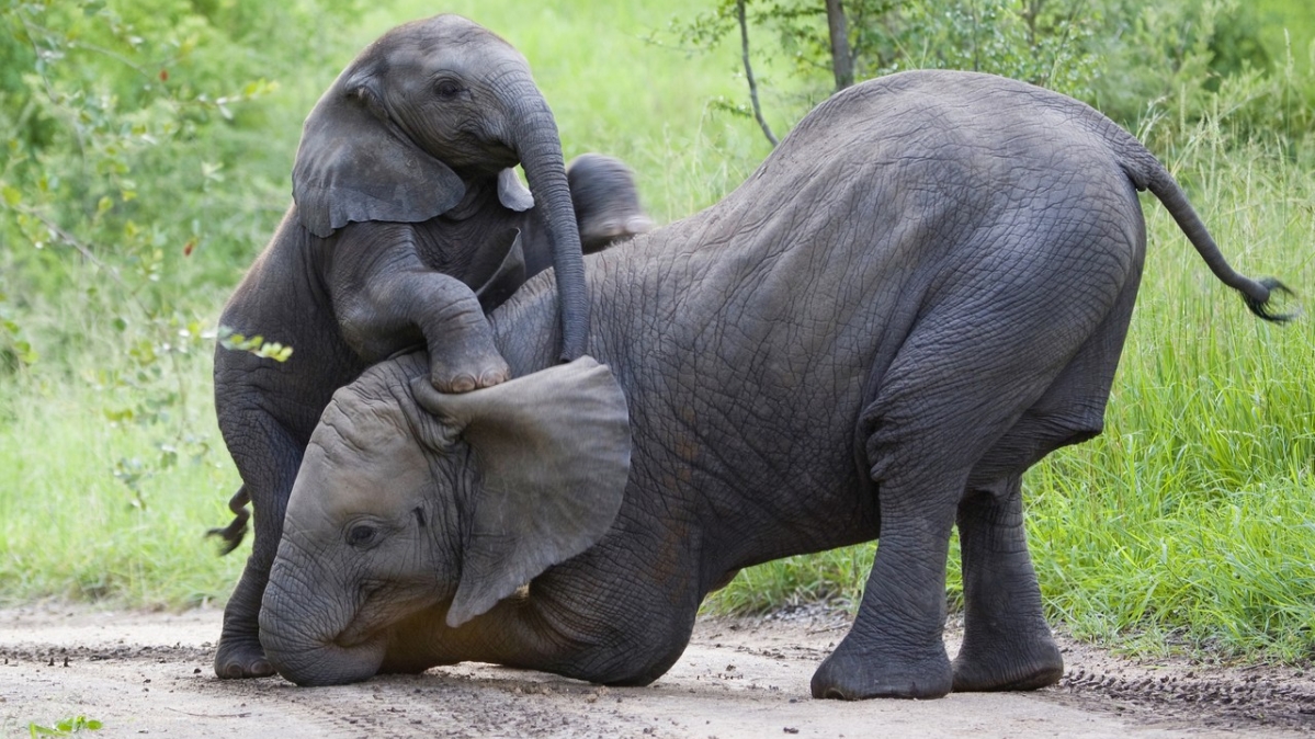 Auf Mama lässt sich hervorragend herumklettern Im Krüger Nationalpark in Südafrika gibt es viele Elefanten zu beobachten.