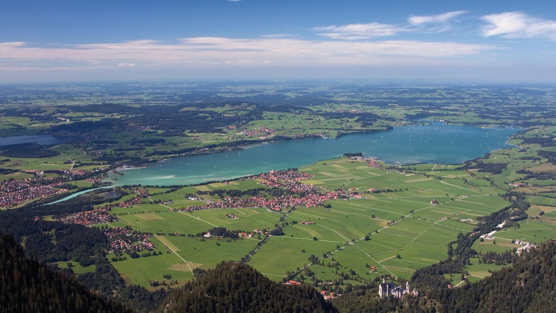 Zwei deutsche Superlative auf einem Bild: Schloss Neuschwanstein, das in aller Welt bekannte Märchenschloss König Ludwig II, und der vom Lech durchflossene Forggensee, mit über 15 Quadratkilometern flächenmäßig größter Stausee unseres Landes - wenn er auch hinsichtlich des Stauvolumens von "nur" 168 Millionen Kubikmetern der Bleichtalsperre (Saale) mit 215 Millionen Kubikmetern nicht das Wasser reichen kann. Zwischen 1950 und 1954 entstand das beeindruckende Areal unweit des bayerischen Füssen. Es dient bis heute der Energiegewinnung, dem Hochwasserschutz, zugleich der Niedrigwassererhöhung und wird darüber hinaus als Naherholungsgebiet genutzt.