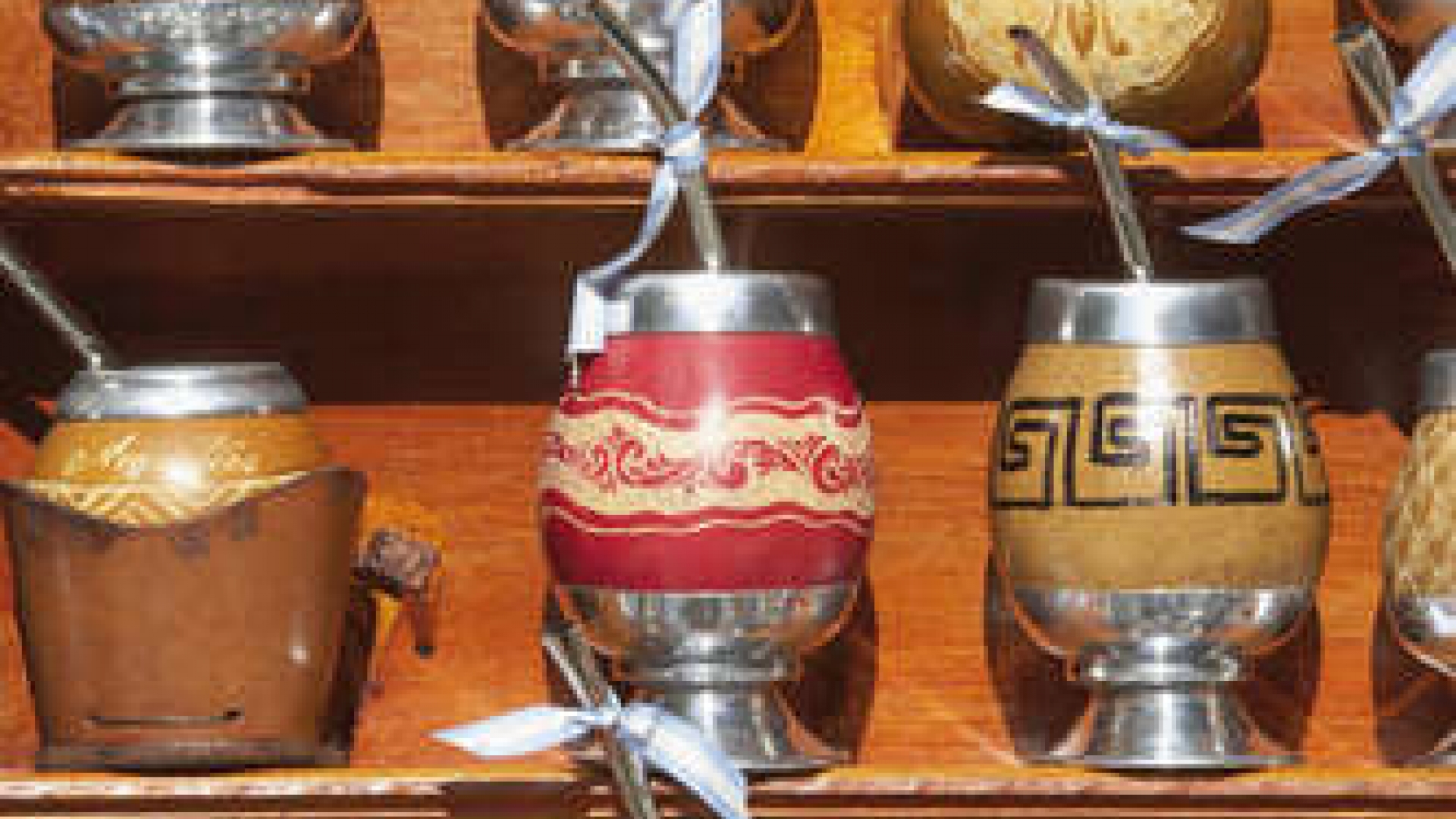 Mate-Tee in Flaschenkürbissen. Mate ist ein südamerikanisches Nationalgetränk, das aus den trockenen Blättern des Matebaums gewonnen wird. Mate enthält 0,5-1,5% Coffein, 7-11% Gerbstoffe und Bitterstoffe.