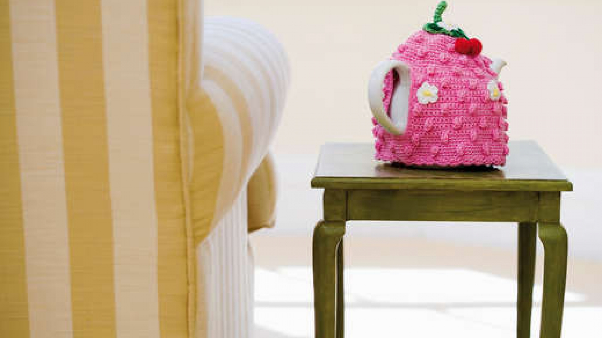 Was die Amerikaner an heißen Tagen mit kalten Getränken machen, tun Teekenner mit heißem Tee an kalten Tagen: Sie isolieren die Kanne oder Tasse. Dieser Überzug ist besonders lieblich und feminin: Rosa Strick mit Blümchen.