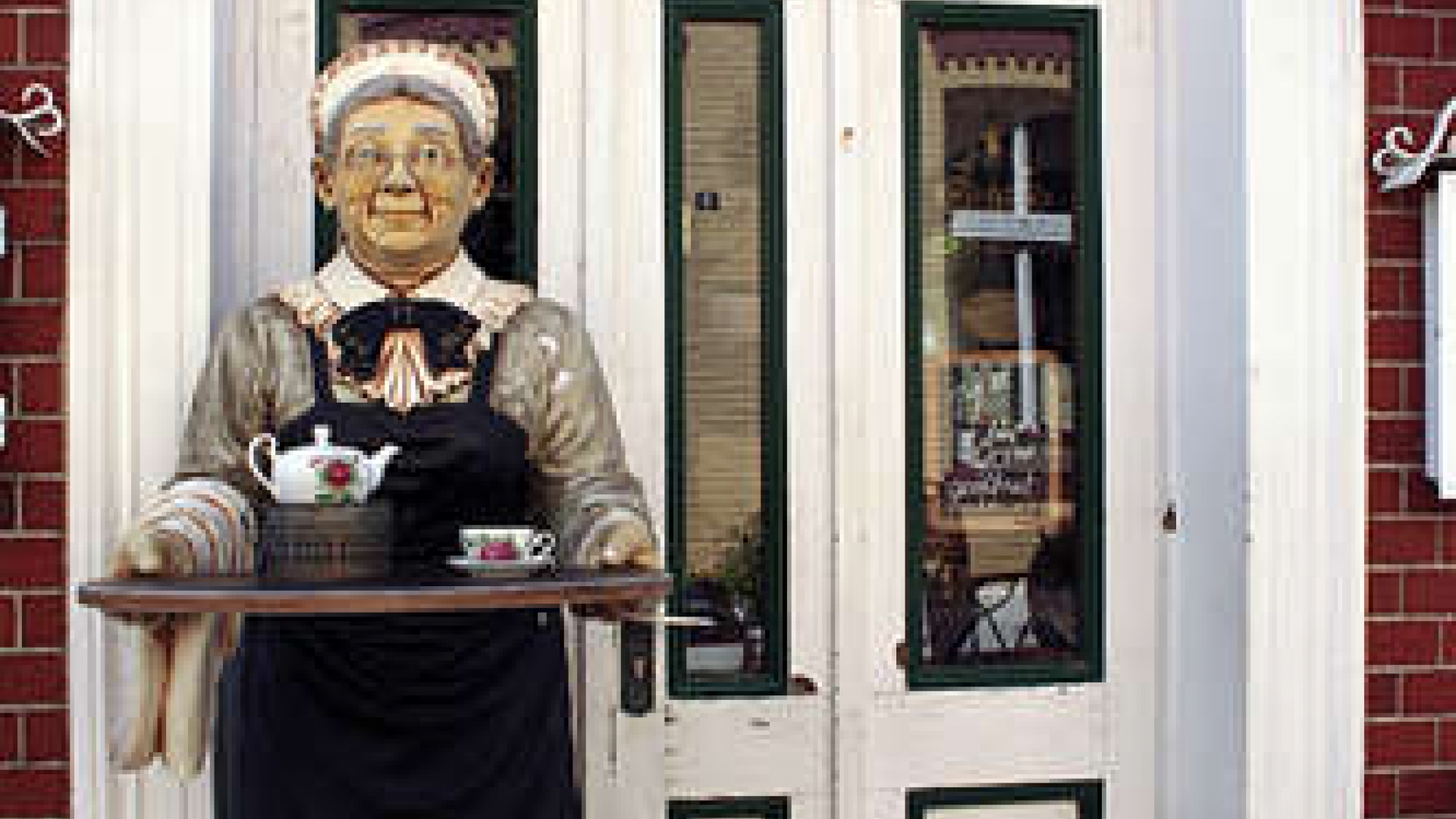 Schon draußen begrüßt Oma die Gäste. Willkommen in der Teestube Borkum! Ostfriesen sind echte Teekenner. Dort schmeckt der Tee einfach genial! Die Oma am Eingang ist übrigens ein Relikt aus früheren Zeiten. Da hieß die Stube noch Omas Teestübchen. Neben Tee gibt's dort Kuchen, Pfannkuchen und andere Köstlichkeiten!