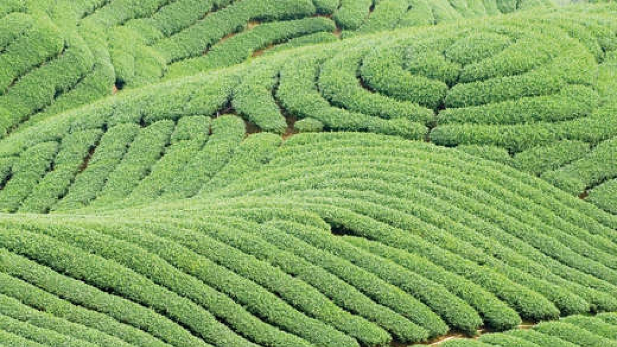 Typische Teeplantage in Asien: voller Furchen, hügelig und grün.