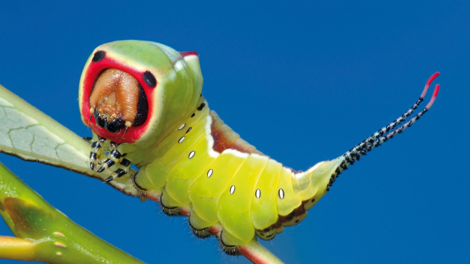 Die Raupe des Falters "Großer Gabelschwanz" misst bis zu 80 Millimeter. Ihr Körper ist hellgrün in der Grundfarbe. Ihr putziges Gesicht täuscht auf den ersten Blick, denn die Gabelschwanz-Raupe hat sogenannte "Scheinaugen". Das eigentliche Gesicht liegt darunter. Nach der Verwandlung in den Falter, sieht man den nachtaktiven Flattermann ab Ende April.