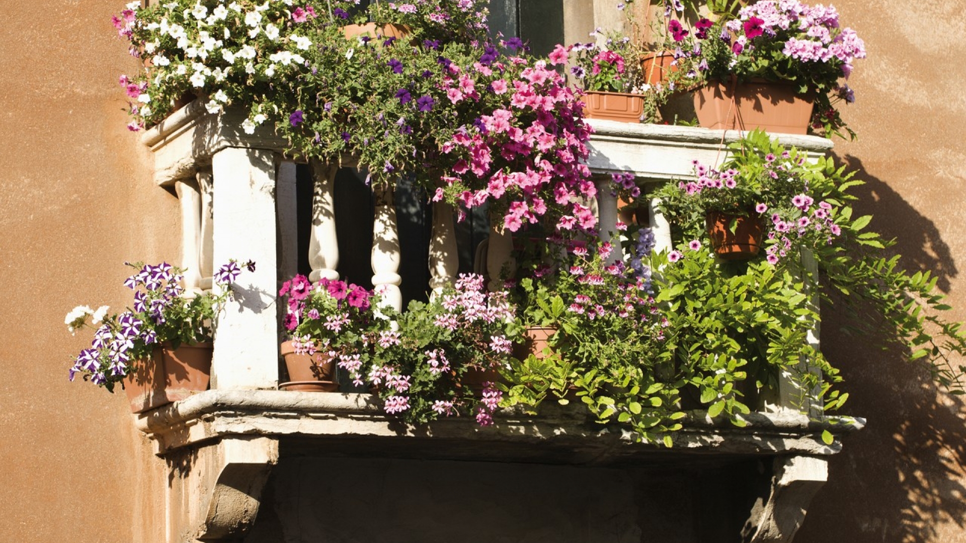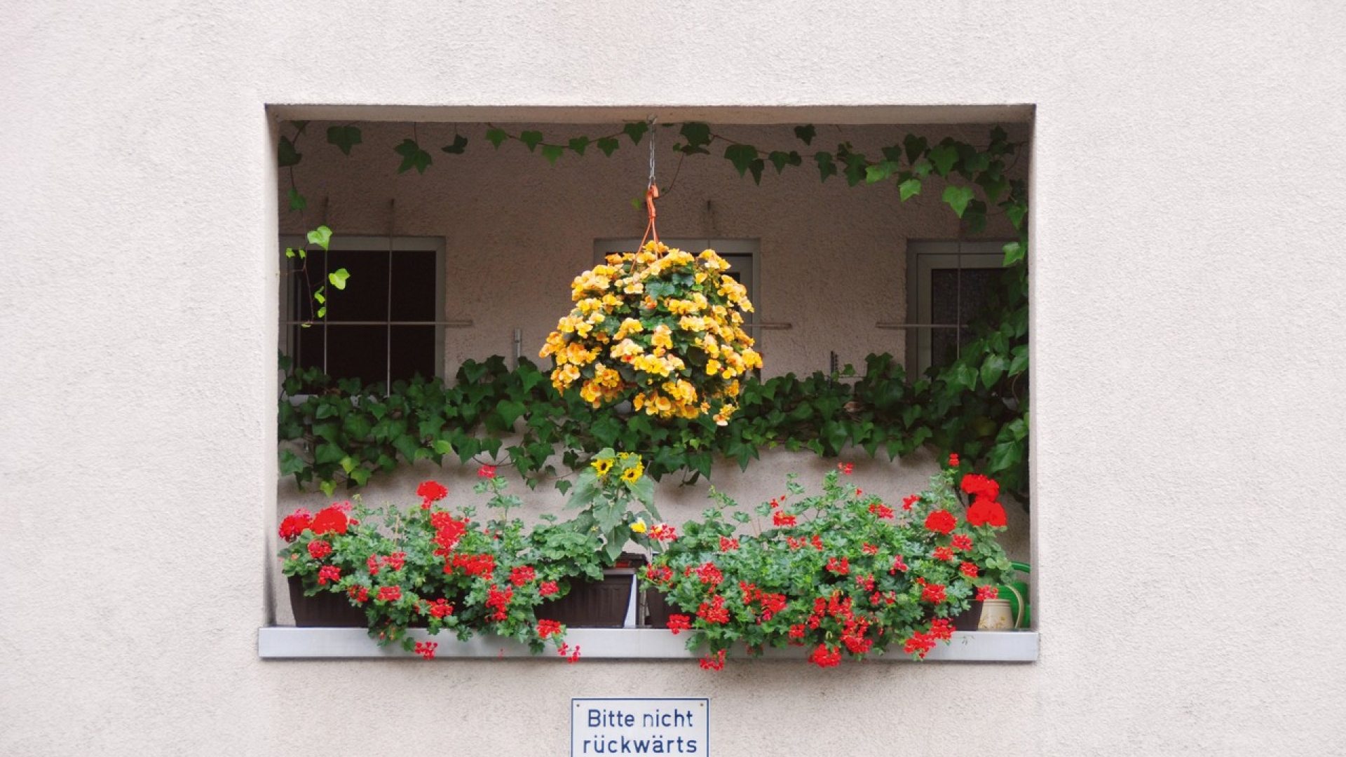 Rot, gelb, grün wie die Farben der Ampel sind die Blumen auf diesem Balkon angelegt. Da würde sich neben dem Schild "Bitte nicht rückwärts parken" ein rotes "Stopp"-Schild auch nicht schlecht machen.