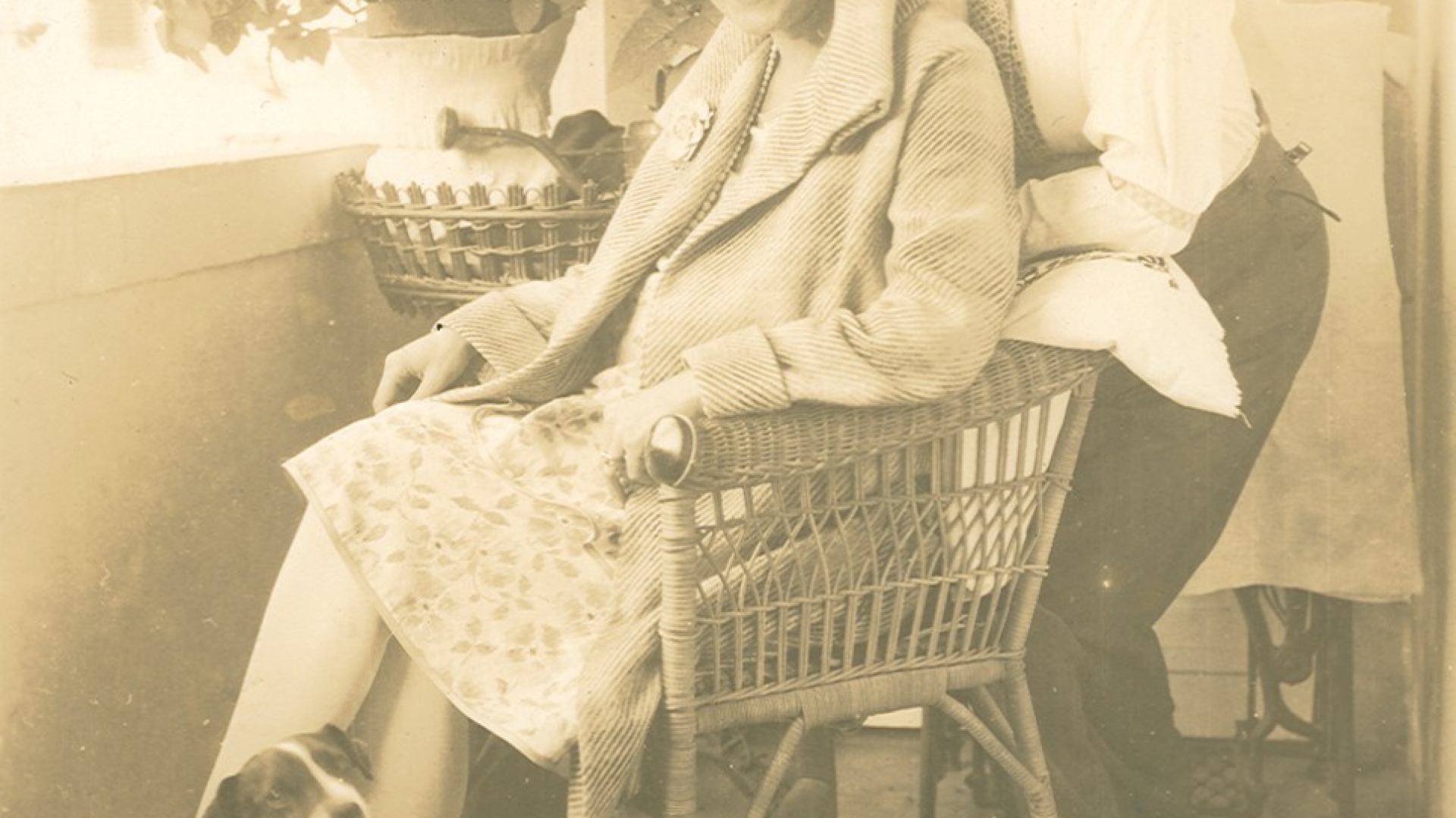 Ein Ehepaar posiert mit seinem Hündchen auf dem Balkon. Das Bild wurde am 16. September 1928 aufgenommen.