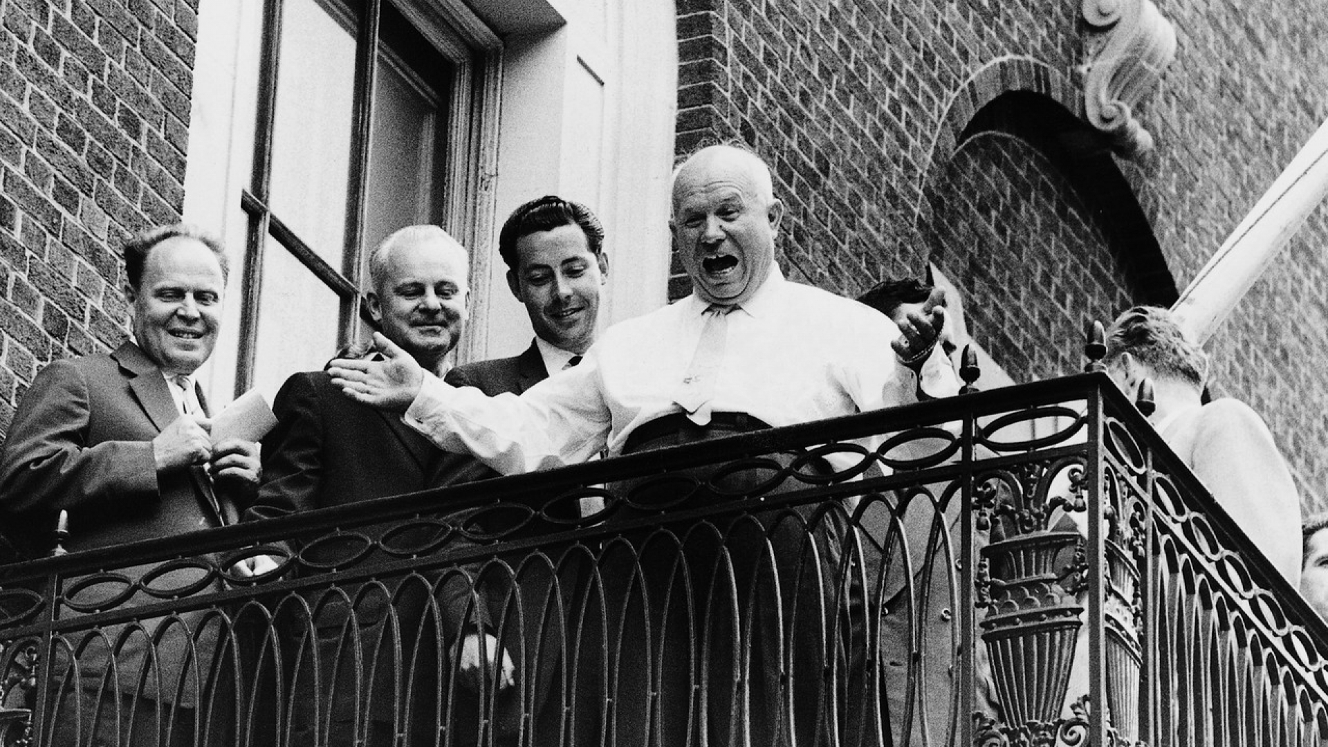 Vom Balkon des Hauptquartiers der sowjetischen UN- Delegation in New York aus gibt Nikita Chruschtschow (r.) am 21.September 1960 eine Pressekonferenz. Zu seiner Linken sein persönlicher Übersetzer, daneben der sowjetische Botschafter in den USA, Mikhail Menschikow.