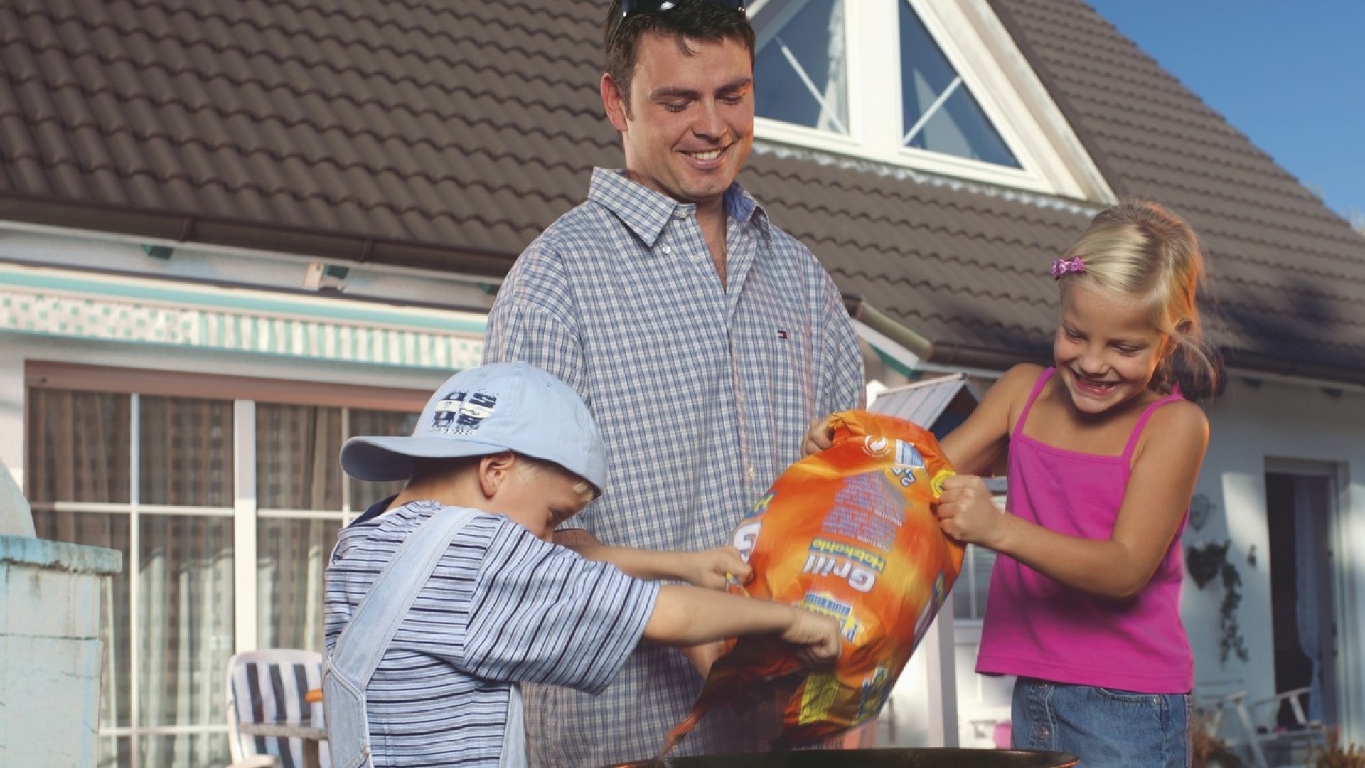 Ein Sommer ohne grillen, das geht nicht! Ein Vater schmeißt mit der Hilfe seiner beiden Kinder einen Grill an.