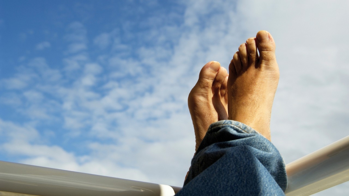 Ins Blaue blicken und spüren, wie der Wind druch die Zehen fährt. So gibt sich dieser Mann seinem Feierabend hin.