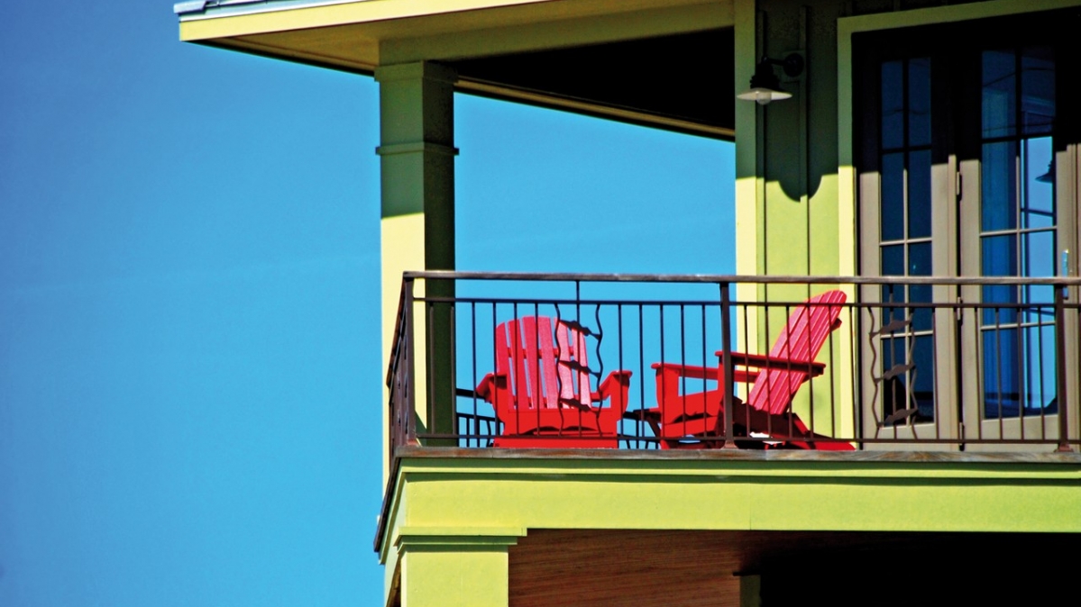 Strahlend blauer Himmel über der Dachterrasse. Da passen die knallroten Liegestühle und das grüne Haus wunderbar dazu.
