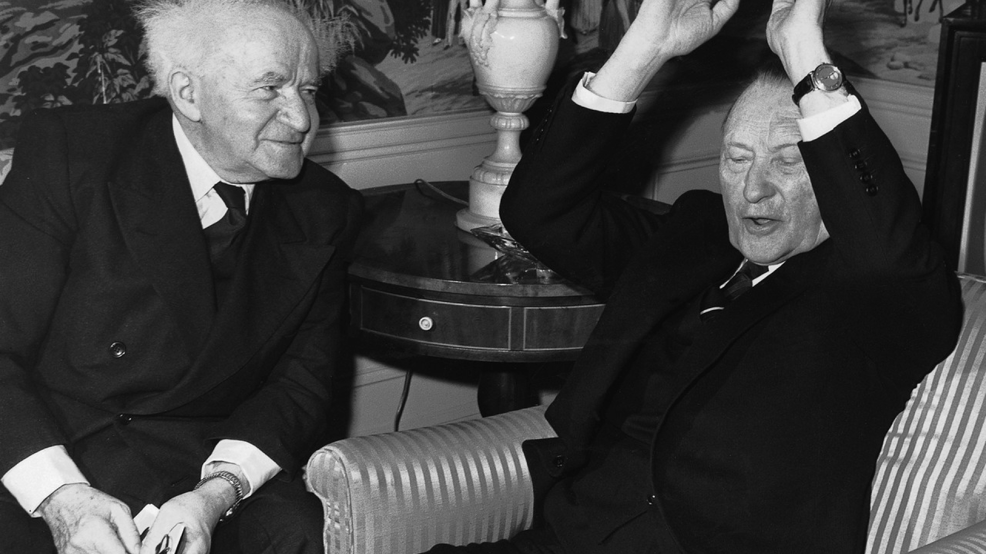 Es ist ein Treffen, das das Attribut "historisch" verdient hat: die Zusammenkunft des deutschen Bundeskanzlers Konrad Adenauer und des israelischen Ministerpräsidenten David Ben-Gurion am 14. März 1960 im berühmten Waldorf-Astoria Hotel in New York. Fünfzehn Jahre nach Ende des Holocausts ist es der Beginn einer Verständigung zwischen dem deutschen und dem jüdischen Staat. Für Adenauer ist es eine moralische und politische Pflicht, Wiedergutmachung für die Naziverbrechen zu leisten. Ben-Gurion seinerseits glaubt an ein neues, demokratisches Deutschland und benötigt Mittel, um die Wirtschaft und Infrastruktur in seinem Land aufzubauen. In der ersten Hälfte der 1960er Jahre schickt Deutschland kostenlos Schiffe, Lokomotiven und viele andere Industriegüter nach Israel. Am 12. Mai 1965 bietet Deutschland dann Israel volle diplomatische Beziehungen an.Heute ist Deutschland in Wirtschaft und im Handel, im kulturellen Austausch und in vielfältigen Partnerschaften von Städten, Schulen und Vereinen der nach den USA zweitwichtigste Partner Israels.
