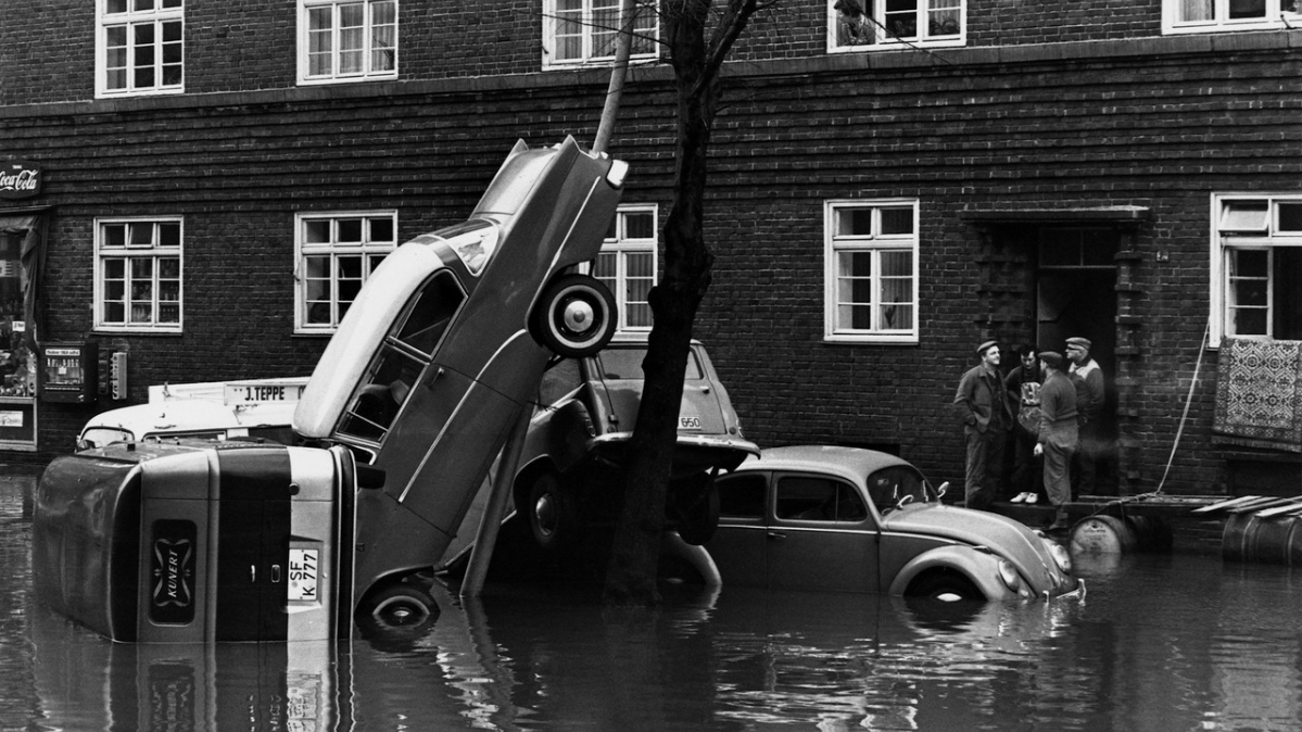 1962 wütet die schlimmste Sturmflut seit 100 Jahren in Hamburg. Auslöser ist das Sturmtief "Vincinette". Es fegt mit Orkanböen bis zu 200 Stundenkilometern über Norddeutschland hinweg, drängt das Wasser der Nordsee als meterhohe Flutwelle in die Elbe und lässt die Deiche brechen. Mehr als 300 Menschen sterben, 20.000 Menschen müssen evakuiert werden, ein Sechstel des Staatsgebietes ist überschwemmt, ganze Stadtteile verwüstet, Strom, Gas und Wasser fallen aus und alle Verkehrswege in den Süden Deutschlands sind unterbrochen. Geschätzter Sachschaden: über eine Milliarde DM. Erst in letzter Minute wird offiziell Alarmstufe drei ausgelöst. Eine groß angelegte Rettungsaktion beginnt. Erstmals beteiligt sich die Bundeswehr an einer zivilen Hilfsaktion.In der Krise macht sich der damalige Innensenator Helmut Schmidt einen Namen. Er leitet eine vorbildliche Rettungsaktion. Und sein besonnenes aber wirkungsvolles Handeln bringt ihm höchste Akzeptanz und großes Ansehen.