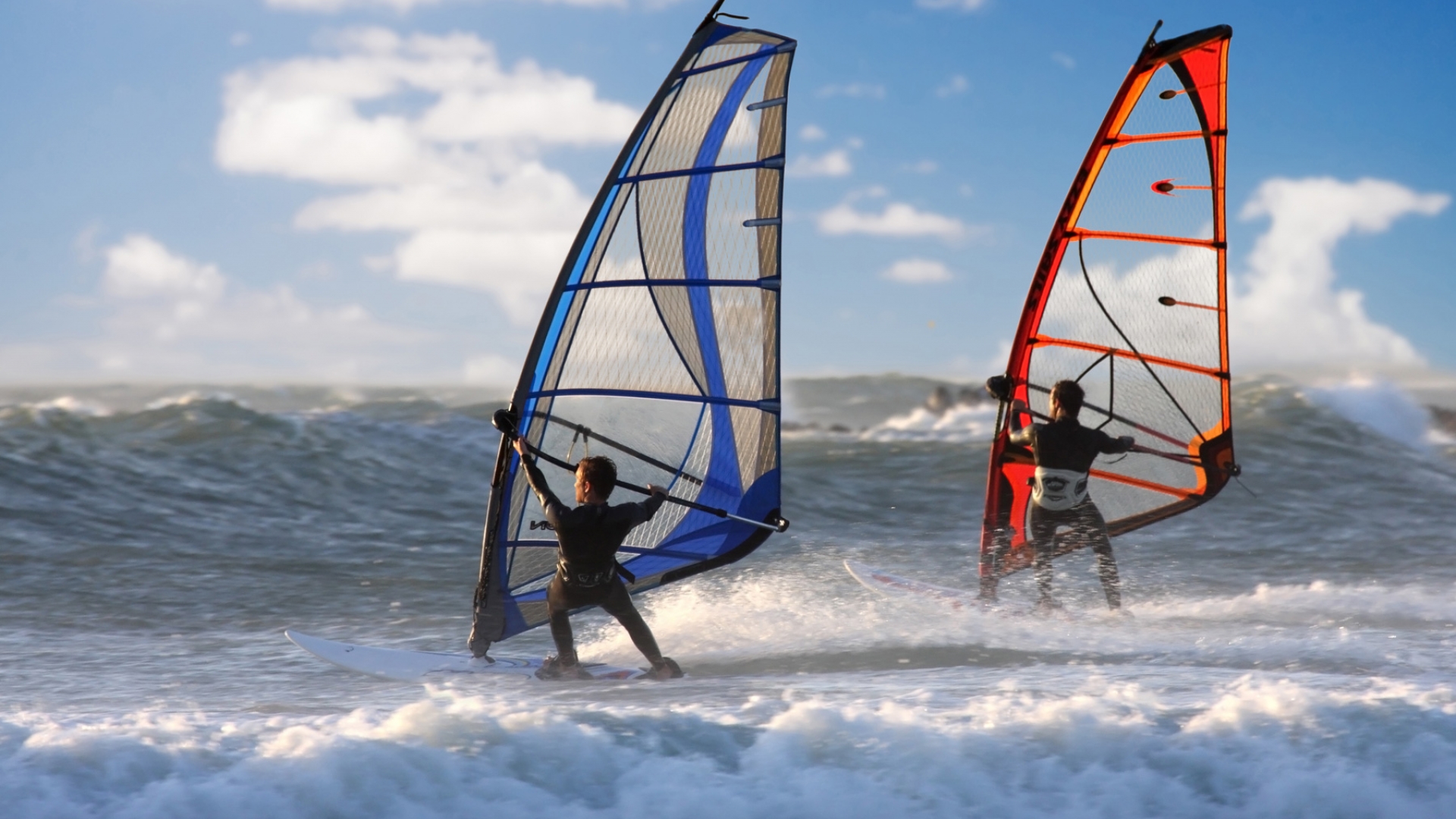 Zwei Windsurfer auf dem Meer.Mehr zum Thema Windsurfing.