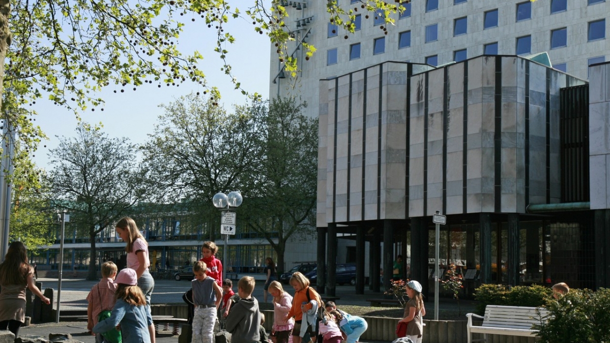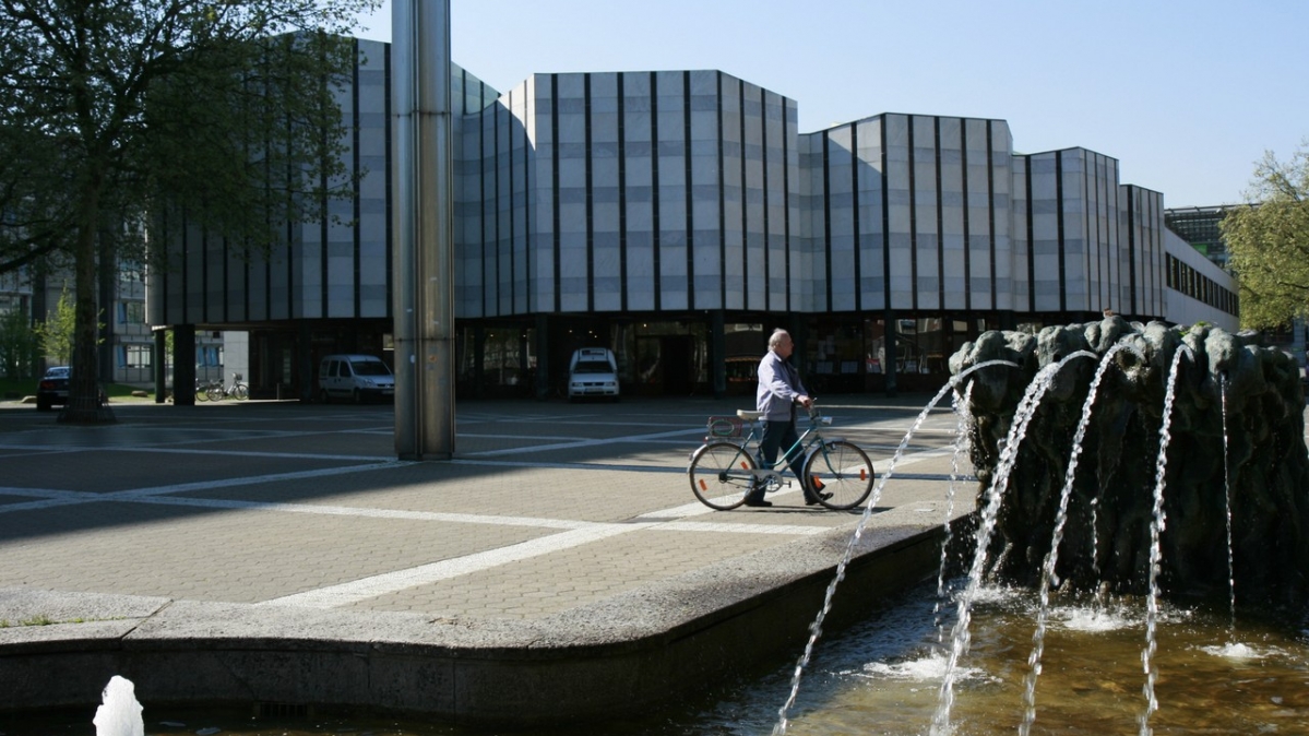 Das 1962 eingeweihte Alvar-Aalto-Kulturhaus auf der Porschestraße und dahinter das Rathaus Wolfsburg.